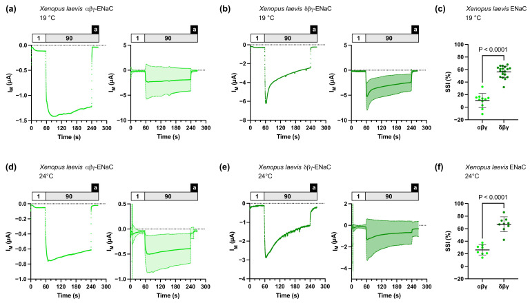 Figure 2. Sodium self-inhibition (SSI) of Xenopus laevis αβγ- or δβγ-ENaCs heterologously expressed in Xenopus oocytes. (a) Left panel: representative transmembrane (IM) recording of an oocyte expressing αβγ-ENaC at 19 °C; right panel: mean ± SD plotted from experiments as shown in the left panel (n = 11). (b) Left panel: representative transmembrane (IM) recording of an oocyte expressing δβγ-ENaC at 19 °C; right panel: mean ± SD plotted from experiments as shown in the left panel (n = 19). (c) SSI was calculated as the percent decrease in amiloride-baseline subtracted IM within 3 min after switching the extracellular solution from low-sodium (1) to high-sodium (90) ORS. For αβγ-ENaC, n = 11; for δβγ-ENaC, n = 19. Student’s unpaired t-test (two-tailed). (d,e) Similar to panels (a,b) with recordings performed at 24 °C, for αβγ-ENaC, n = 8; for δβγ-ENaC, n = 9. (f) Similar to panel (c) with data from recordings performed at 24 °C, for αβγ-ENaC, n = 8; for δβγ-ENaC, n = 9. Student’s unpaired t-test (two-tailed). Notes: 1 = low-sodium ORS containing 1 mM NaCl; 90 = high-sodium ORS containing 90 mM NaCl; a = amiloride.