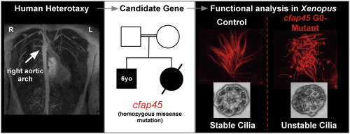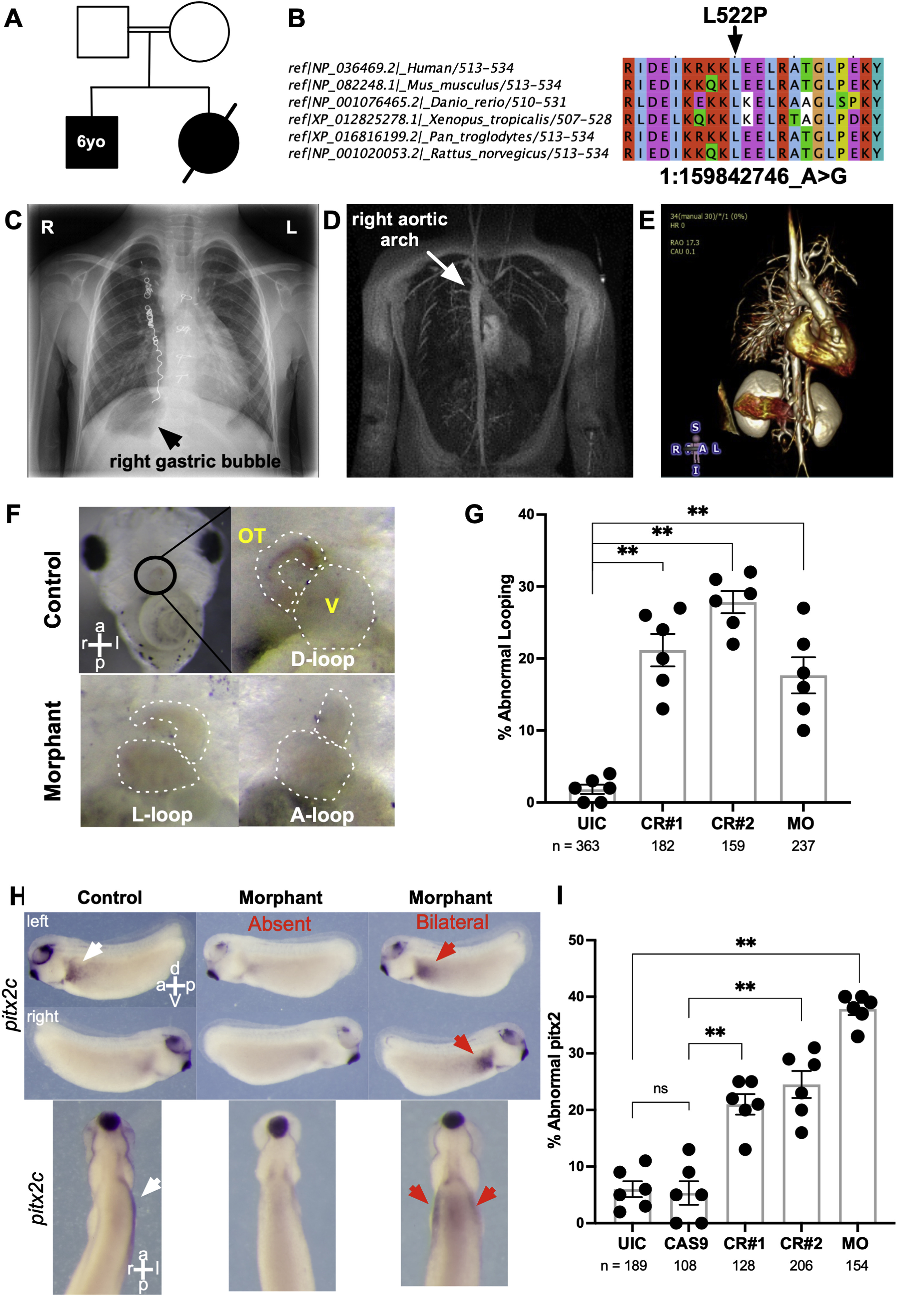 Fig. 1. cfap45 loss-of-function in humans and Xenopus leads to heterotaxy phenotype (A) Family pedigree showing the affected 6yo patient and the similarly affected sibling who died at 25 days of life. (B) Multiple alignments around the patient variant L522P demonstrate a remarkable degree of conservation of amino acids. (C) Chest X-ray shows the right gastric bubble. (D) CT-scan of the chest and (E) 3D reconstruction shows the right aortic arch indicating abnormal left-right patterning (F) The first row shows the tadpole heart in uninjected control (D-loop), and the second row shows the morphant with abnormal (L and A-loop) looping states at stage 46 Xenopus heart. The cardiac sac is magnified, the outflow tract border and the ventricle are outlined in white. OT: outflow tract; Ventricle. (G) The graph represents abnormal looping percentages in G0 mutants (Crispr#1, Crispr#2) and morphants. Each point represents one experimental group. (H) cfap45 knockdown leads to pitx2c abnormalities. The first column shows normal pitx2c expression in the left lateral mesoderm and is absent on the right of stage 2831 Xenopus embryos, highlighted with a white arrow. The second and third columns show abnormal pitx2c expression as absent or bilateral, highlighted with red arrows following MO mediated cfap45 depletion. (I) The graph represents abnormal pitx2c expression percentages in G0 mutants (Crispr#1, Crispr#2) and morphants. Each point represents one experimental group. D: dextro, L: levo, A: ambiguous. p < 0.05, p < 0.01, p < 0.001, p < 0.0001.