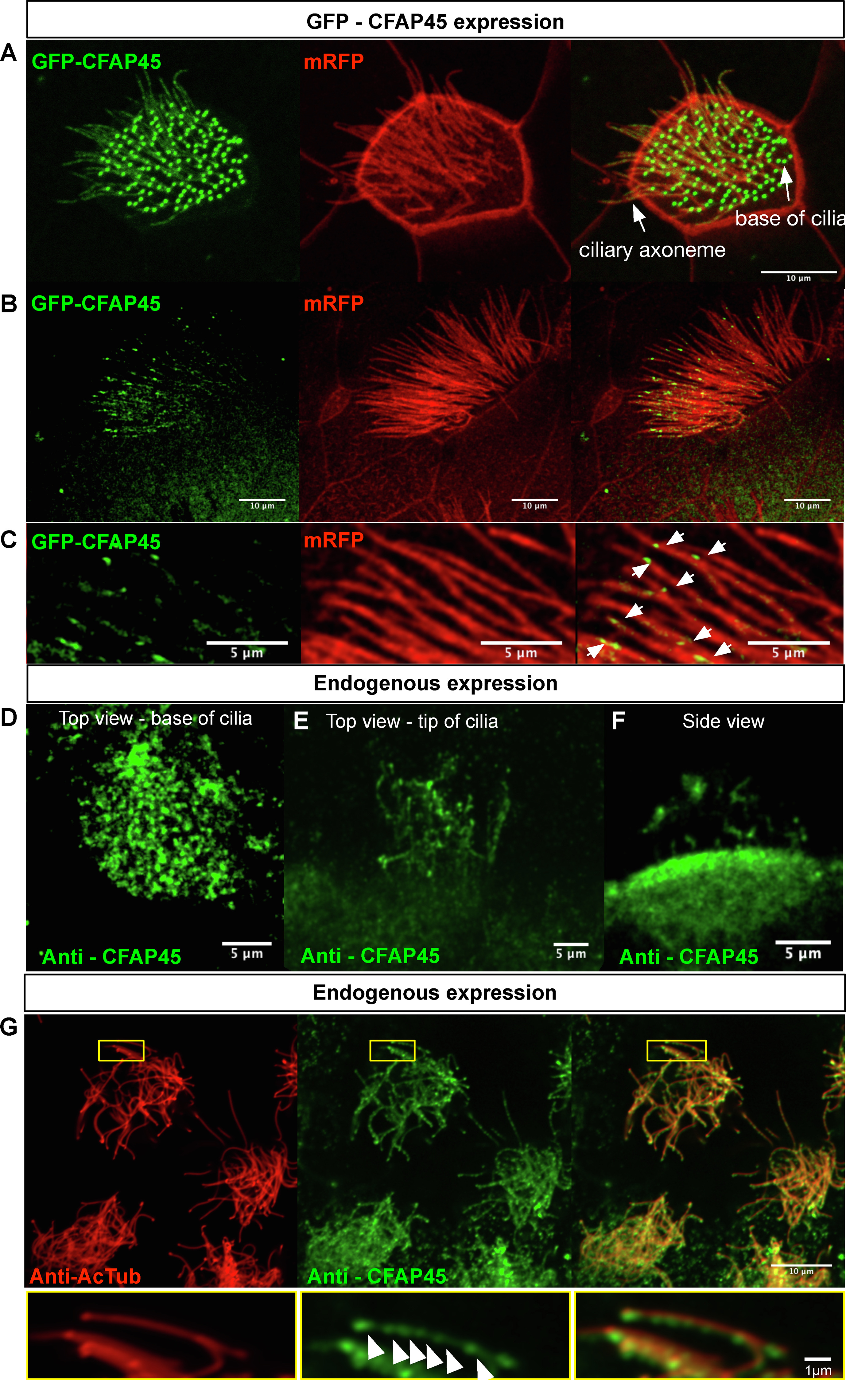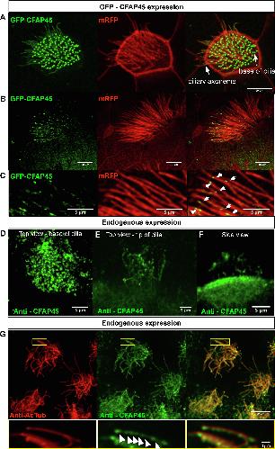 Fig. 6. Cfap45 localization in X.tropicalis MCCs (AC) X. tropicalis epidermis expressing GFP-CFAP45 and membrane RFP. (A) Focus is concentrated on the base of the cilia where GFP-CFAP45 is expressed, (B) Focus is concentrated on the cilia showing the dotty localization along the axonemes. (C) Magnified views. White arrows highlight GFP-CFAP45 localization. (DF) X. tropicalis epidermal MCCs labeled with anti-CFAP45. (D) Top view focusing on the base of the cilia at the apical surface. (E) Top view focusing on the cilia axonemes. (F) Side view showing apical surface and cilia staining. (G) X. tropicalis epidermal MCCs labeled with anti-acetylated -tubulin (red, cilia) and anti-CFAP45 (green). Anti-CFAP45 staining pattern is identical to the GFP-CFAP45 expression, showing CFAP45 localization to the cilia in a dotty fashion in the magnified views along the bottom (white arrows).