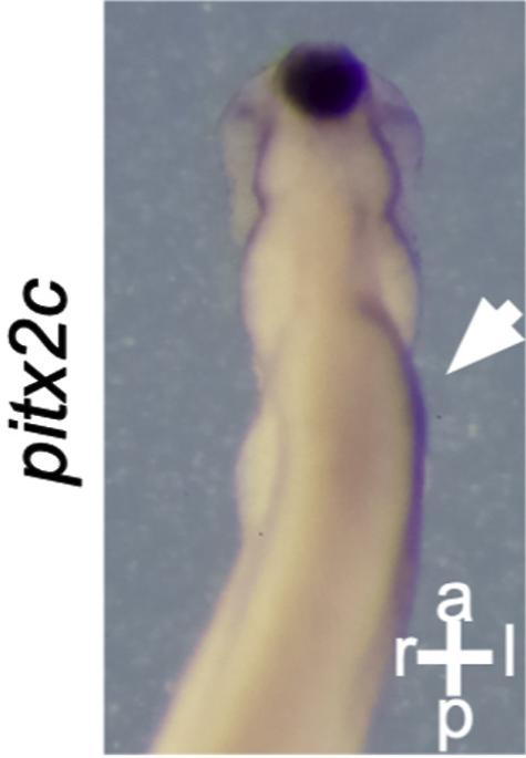 pitx2 (paired like homeodomain 2) gene expression in Xtropicaluis embryo, NF stage 28, assayed via in situ hybridization, lateral view, showing the asymmetrical expression in lateral plate mesoderm on left and right sides of the embryo.