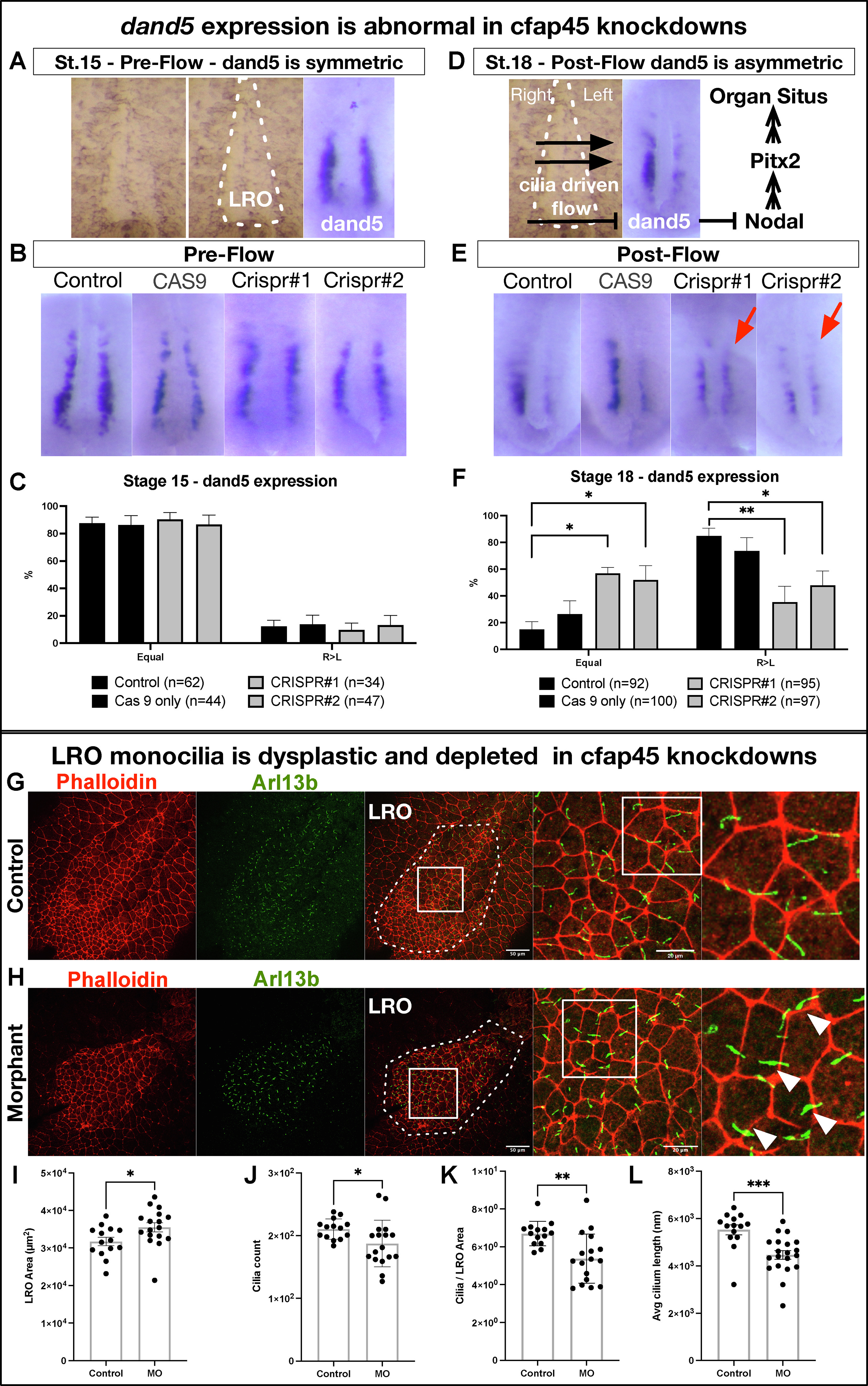 Fig. 2. cfap45 knockdown causes abnormal dand5 expression and defects in LRO cilia (A) dand5 is expressed bilaterally symmetrical in the LRO at stage 15 (pre-flow). (B) Pre-flow, normal bilateral expression of dand5 was observed in G0 mutants compared to uninjected or only CAS9 injected controls. (C) Percentages of normal (equal) and abnormal (R > L) dand5 expression in stage 15 (pre-flow) LROs. G0 mutants show no difference compared to uninjected and Cas9 injected controls. n = number of embryos. (D) At stage 18, right to left cilia-driven fluid flow has emerged, suppressing dand5 expression on the left side of the LRO. (E) Post-flow, normal reduced left side expression in uninjected and Cas9 injected controls show up as abnormal bilateral expression in G0 mutants indicated with red arrows. (F) Percentages of normal (R > L) and abnormal (equal) dand5 expression in stage 18 (post-flow) LROs. A significant number of G0 mutants show abnormal bilateral dand5 expression compared to uninjected and Cas9 injected controls—n = number of embryos. (G–H) LROs stained with phalloidin to label cell borders and anti - Arl13b antibody to label monocilia. The white dashed line indicates the LRO area. LRO monocilia were malformed and lost in morphants, also showing bulging at the tip and midshaft of the cilia, indicated by white arrows. White squares indicate the magnified areas (H). LRO area is slightly enlarged (I), and cilia numbers (J), cilia per LRO area (K), and cilia length are reduced in morphants. MO: Morpholino oligo, LRO: Left-right organizer.∗p < 0.05, ∗∗p < 0.01.