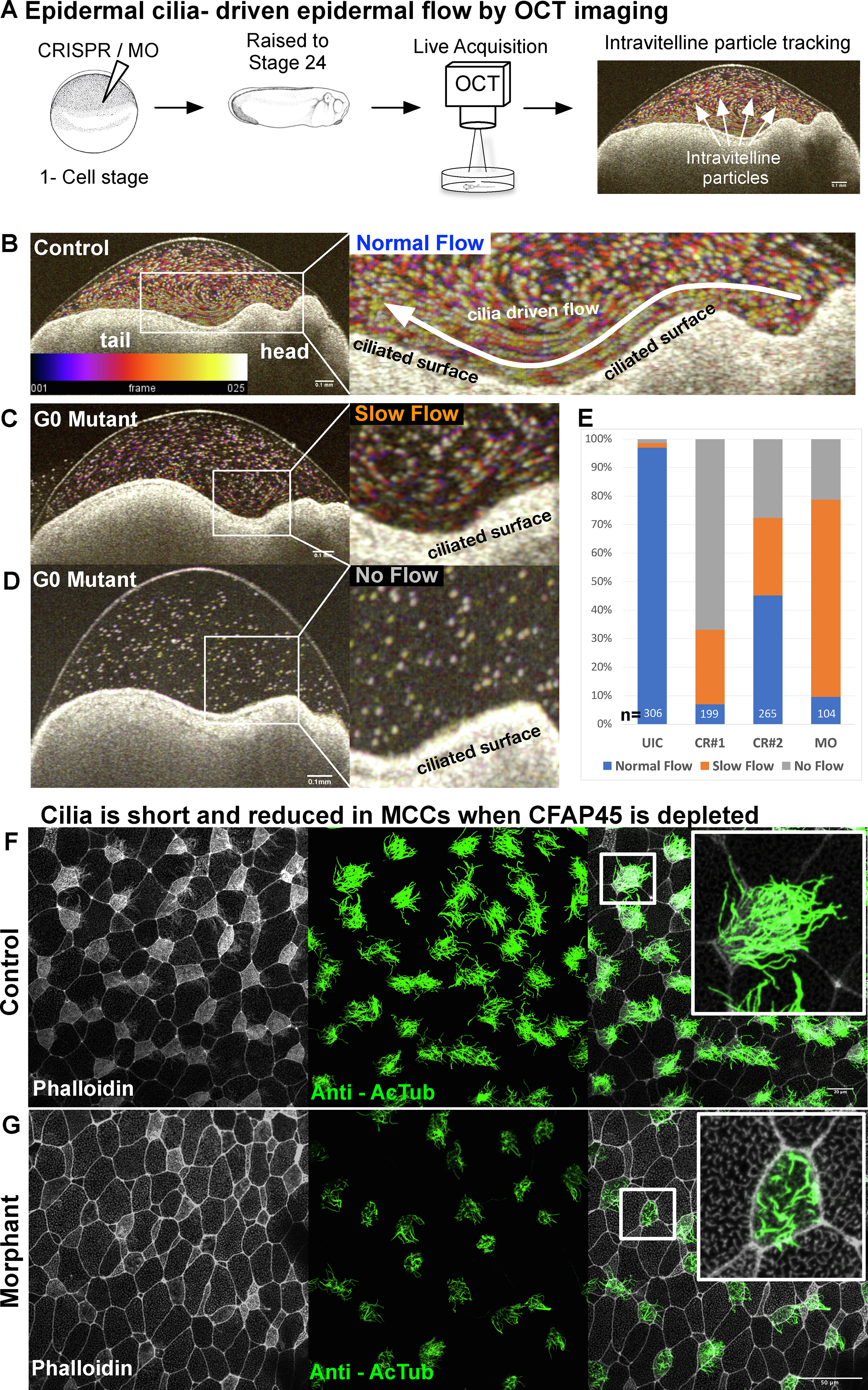 Fig. 3. cfap45 knockdown causes abnormalities in cilia-driven epidermal flow and leads to defects in epidermal multicilia. (A) Epidermal multicilia beating is planarly polarized, generating head-to-tail fluid flow along the surface. This flow can be visualized using Optical Coherence Tomography (OCT) imaging, where intravitelline endogenous particle movements can be tracked in vivo (Movie1). (BE) We obtained real-time OCT movies and, using 25 frames, built particle trajectories with ImageJ. Temporal color coding depicts particle trajectory over time. The color bar represents color versus the corresponding frame number in the color-coded image. Based on the trajectory map over 25 frames, we classified the flow as normal (B), slow (C), or absent (D). When cfap45 is depleted, the epidermal flow is significantly slower or stationary. (E) Based on OCT imaging, percentages of embryos with normal, slow, and no-flow in uninjected controls and cfap45 depleted tadpolesn = number of embryos. (FG) Cilia are lost in multiciliated cells (MCCs) when Cfap45 is depleted with MO. Epidermal MCCs marked with anti-acetylated-tubulin (green) for cilia and phalloidin (white) for actin.