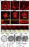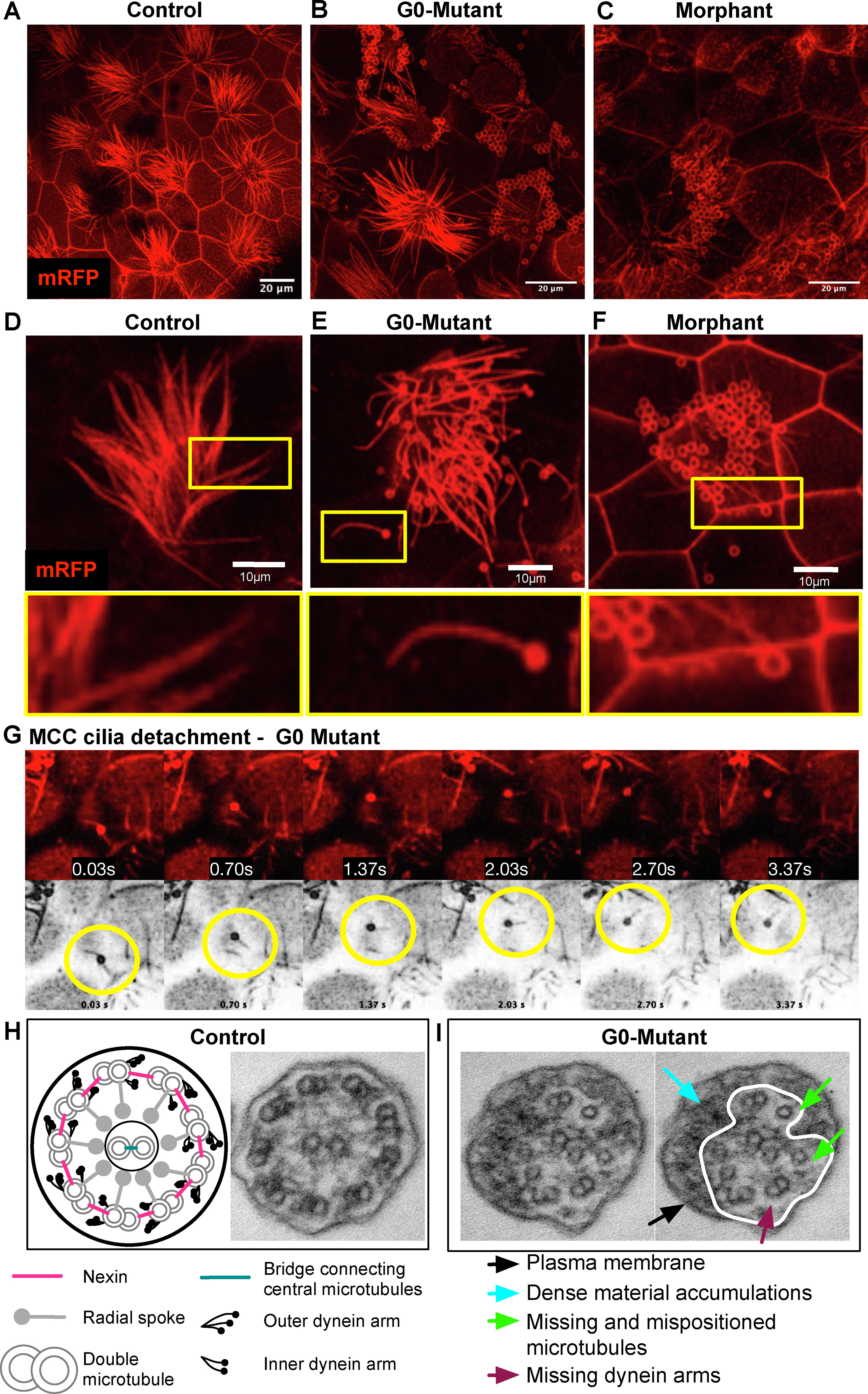 Fig. 4. Epidermal MCCs demonstrate axonemal disorganization and instability when cfap45 is knocked down (AC) Wide-field images of the Epidermal MCCs marked with membrane RFP in controls (A), G0 mutants (B), and morphants (C). When cfap45 is depleted, most MCCs display curled and shortened cilia (Multimedia component 2, Multimedia component 3). (D-F) Focused and magnified MCC images in control (D), G0 mutants (E), and morphants (F) show curling of the cilia leading to shortening and suggesting that the deformation leads to detached cilia. (G) Montaged images from live G0 mutant epidermal cilia imaging show the detached, free-floating cilium. The bottom row is colored black and white to track better the detached cilium encircled in yellow. (H) Electron Microscope image of the transverse section of the epidermal MCC shows 9 + 2 microtubule organization. A pair of microtubules is surrounded by nine pairs connected with radial spokes. This organization is abnormal when cfap45 is depleted using CRISPR.