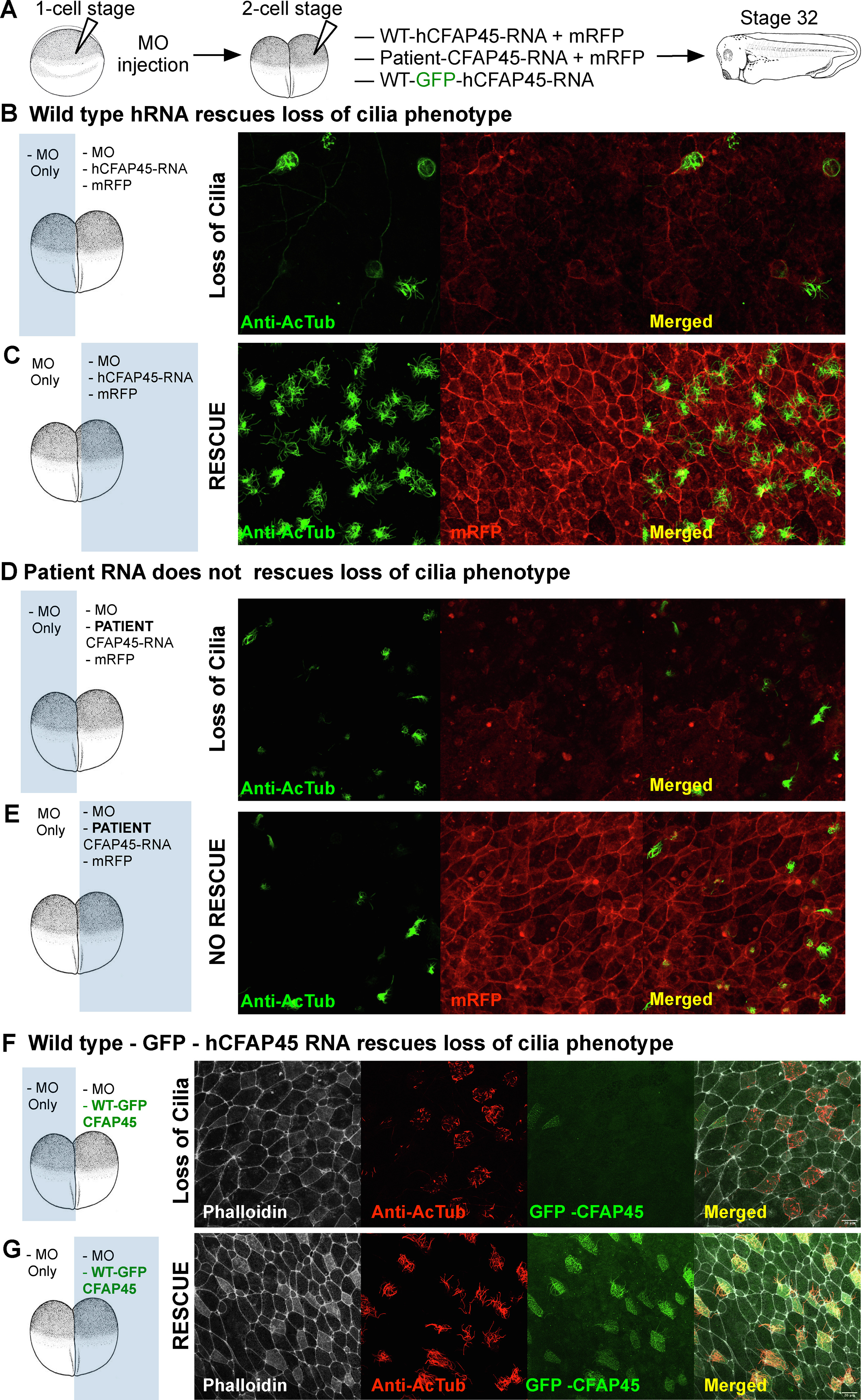 Fig. 5. Wild-type human cfap45 mRNA rescues loss of cilia phenotype, whereas the patient variant fails (A) Experimental setup. First, morpholino is injected at the one-cell stage, followed by human RNA (WT or patient variant) with membrane RFP tracer injection at the two-cell stage. Then, we raised tadpoles to stage 32 to assess epidermal MCCs. (B, D, F) Depletion of Cfap45 by MO results in MCC loss. (C) Wild-type RNA injection at the two-cell stage traced with membrane RFP shows the recovery of the MCCs on the injected side. (E) RNA with patient variation injections traced with membrane RFP fails to recover loss of cilia in MCCs. (G) Wild-type GFP-hCFAP45 RNA injection at the two-cell stage shows the recovery of the MCCs on the injected side. Phalloidin was used to label actin to show cell borders, and an anti-acetylated -tubulin antibody was used to label cilia.