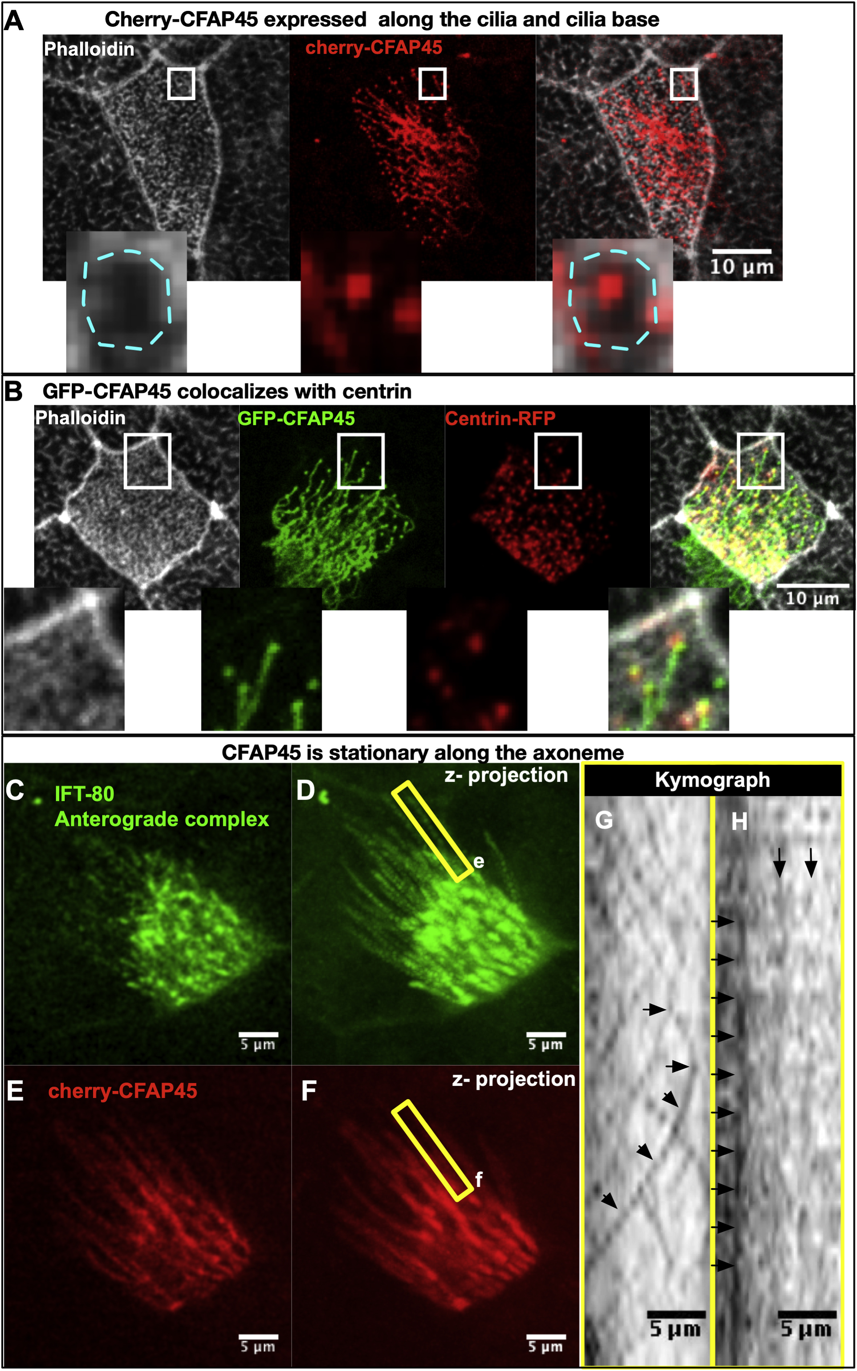 Fig. 7. CFAP45 localized to the base of the cilia and the ciliary axoneme and, unlike IFT80 protein, is stationary within the cilia. (A) Cherry - CFAP45 expressed in the epidermal MCCs. Actin in MCCs stained with phalloidin (grey) delineates the cell borders and the apical actin network where the base of the cilia is located at the center. The magnified view delineates the circular actin network (blue). CFAP45 is enriched at the base of the cilia and situated in the center of the apical network. (B) GFP- CFAP45 expressed in MCCs and colocalized with Centrin at the base of the cilia. (C) IFT-80-GFP expressed in MCC. (D) z-projection of fifty frames. (E) CFAP45-Cherry expressed in MCC. (F) z-projection of fifty frames. (G) Kymograph presents the movement of the IFT80-GFP proteins along the single cilium. Multiple lines represent multiple IFTs. As the protein travels, intensity displaces along the cilium forming tracks over time. One particle tracked over time was marked with black arrows. (H) Kymograph presents stationary CFAP45-cherry protein. As no movement is observed, multiple straight lines form over time, representing the non-uniform punctuated pattern of cfap45. (Yellow rectangle encloses the single cilium analyzed.)