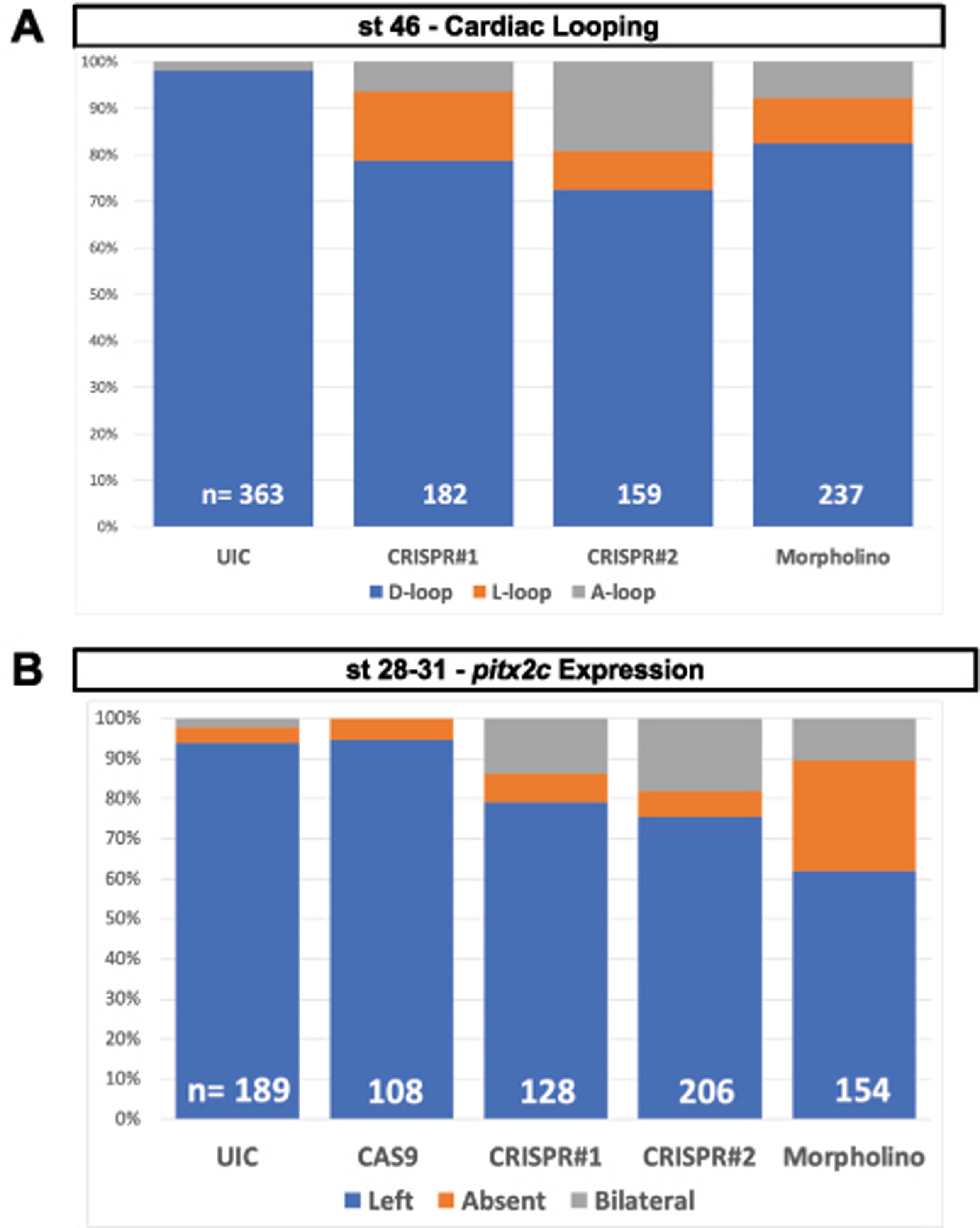 Supplemental Fig. 1. Graphs showing percentages of different abnormal phenotypes for (A) cardiac looping and (B) pitx2c expression.