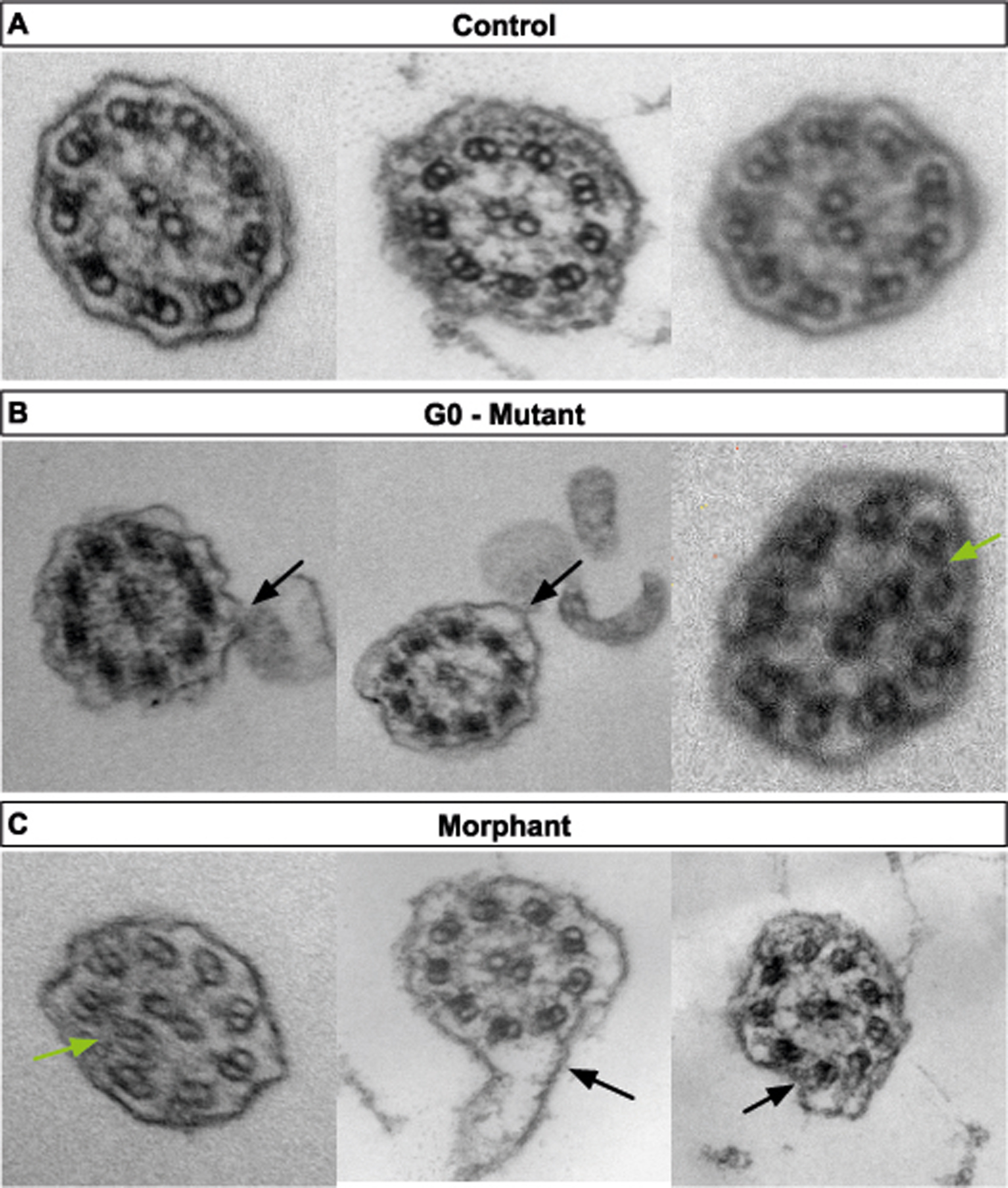 Supplemental Fig. 2. (A)TEM images of transverse sections of multiciliated cell cilia showing normal 9 + 2 microtubule organization in controls. A pair of microtubules is surrounded by nine pairs connected with radial spokes. (BC) TEM images showing abnormal plasma membranes indicated by black arrows and/or abnormal microtubule structure and organization indicated by green arrows in G0 mutants (B) and morphants (C).