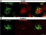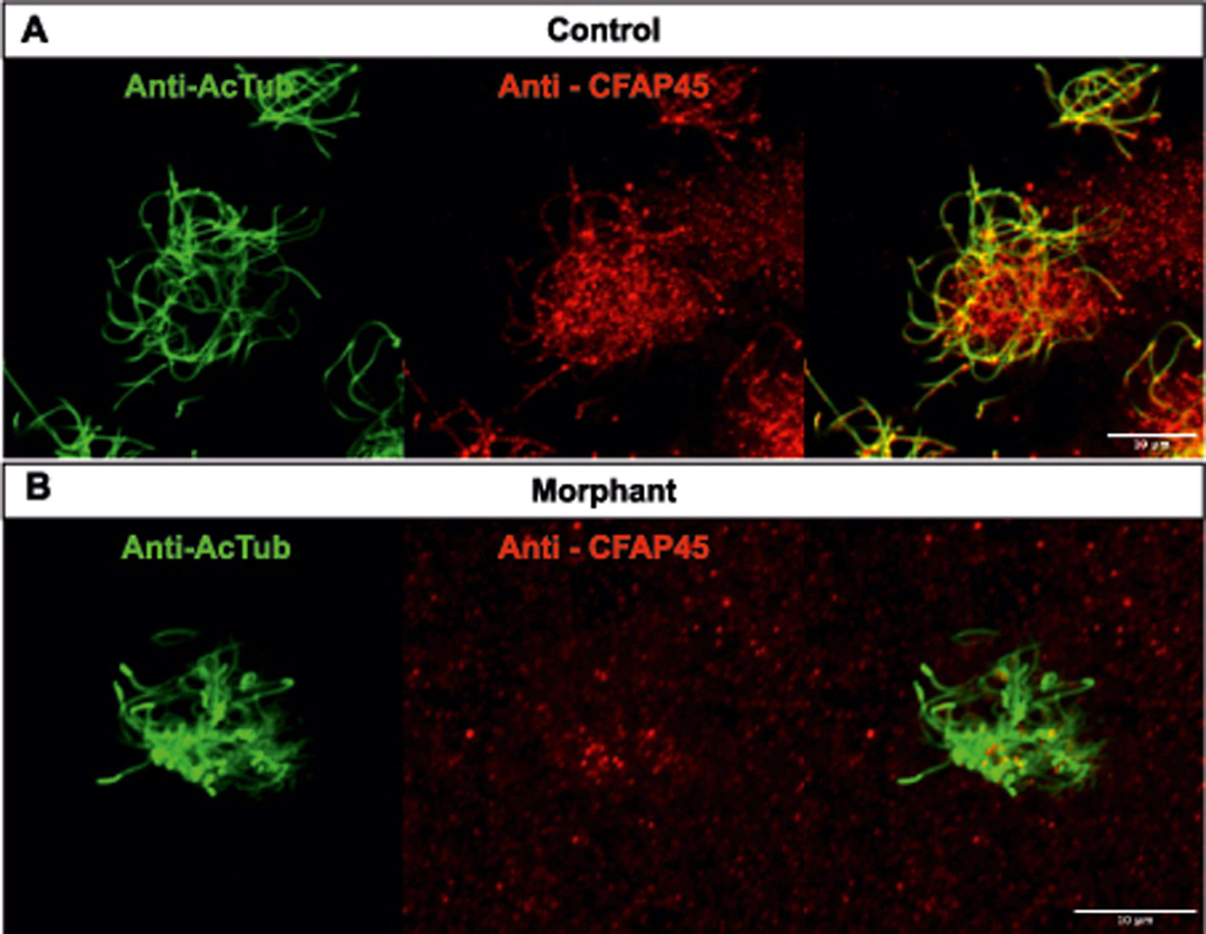 Supplemental Fig. 4. X. tropicalis epidermal MCC labeled with anti-acetylated -tubulin (green, cilia) and anti-CFAP45 (red). (A) Anti-CFAP45 staining showing CFAP45 localization to the cilia in a dotty fashion. (B) Depletion of CFAP45 by MO results in loss of anti-CFAP45 signal and deformed MCC.