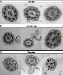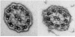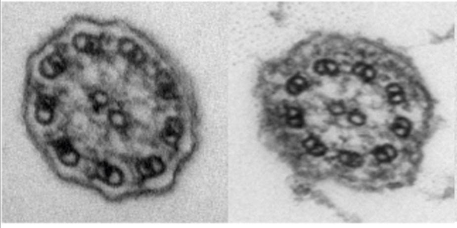 TEM images of transverse sections of multiciliated cell cilia showing normal 9 + 2 microtubule organization