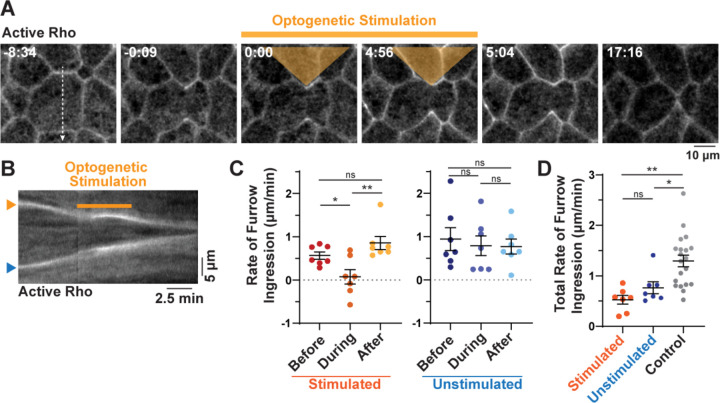 Figure 3:. Optogenetic activation of contractility in one neighbor cells stalls furrowing.A) Micrographs from time-lapse confocal imaging of cytokinesis with optogenetic stimulation of Rho-mediated actomyosin contractility in neighbors on one side of the furrow. Orange triangle and orange line indicate the region and duration of stimulation, respectively. Time shown in minutes:seconds. B) Kymograph of furrow ingression generated from the dashed line shown in (A). Orange arrowhead indicates side of furrow with a stimulated neighbor, blue arrowhead indicates side of furrow with unstimulated neighbor. Orange line indicates the duration of stimulation. C) Quantification of the rate of furrow ingression before, during, and after neighbor cells were optogenetically stimulated. Junctions neighboring the stimulated cells are shown in warm colors, while corresponding junctions with unstimulated neighbors are shown in cool colors. Mean ± SEM. n = 7 junctions, 7 cells, 5 embryos. * p ≤ 0.05 and ** p ≤ 0.005. D) Total rate of furrow ingression for junctions from cells with stimulated (orange) or unstimulated (blue) neighbors, as shown in (C), or for junctions in control cells selected from a region in the field of view that was well separated from the region of optogenetic stimulation. Mean ± SEM. For stimulated and unstimulated junctions: n = 7 junctions, 7 cells, 5 embryos, for control cells: n = 20 junctions, 10 cells, 6 embryos. * p ≤ 0.05 and ** p ≤ 0.005.