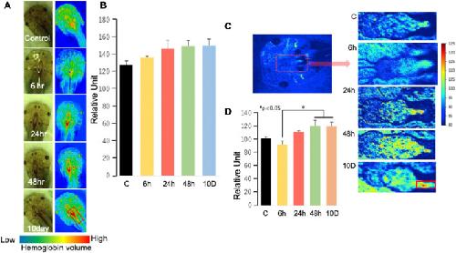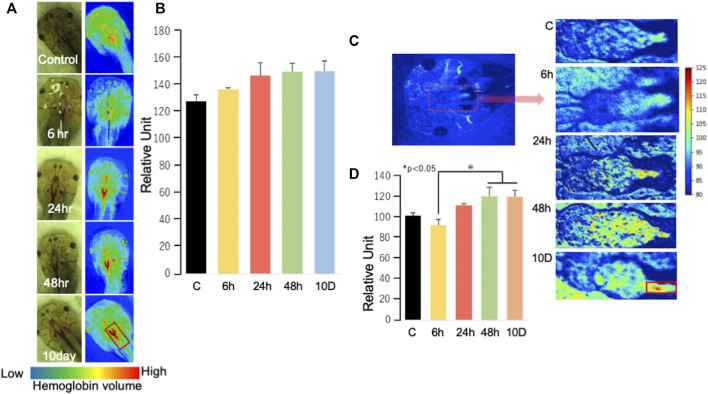 FIGURE 5. Analysis of hemoglobin using a hyperspectral camera (A) Randomly selected tadpoles were analyzed using a hyperspectral camera. The red signal indicates hemoglobin intensity. (B) The signal intensity of hemoglobin was determined by averaging the luminance of the area with high intensity (n = 2). Data were analyzed using ImageJ (ver1.53e: https://imagej.nih.gov/ij/index.html). (C) Oxygen–hemoglobin measurements and C–8D are enlargements of the area surrounded by red dots. (D) Oxygen–hemoglobin analysis in the brain was conducted using a similar method to that described in (B). The number of samples used for the control, 6, 24, 48 h, and 10 days groups were four, three, four, three, and two, respectively. Data were analyzed using ImageJ (ver1.53e). Ex 10 days, Ex 48, Ex 24, Ex 6 h, and control are shown as 10 D, 48, 24, 6 h, and C, respectively. *p < 0.05 represented statistical significance based on one-way ANOVA, followed by a Bonferroni post hoc test or Dunnett’s T3 test.