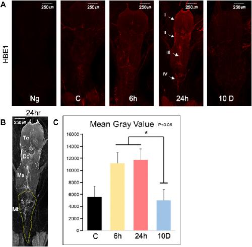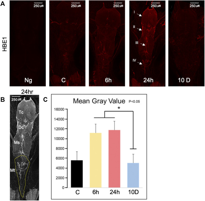 FIGURE 6. Immunohistochemistry of brains from Xenopus tropicalis tadpoles exposed to predation stress. (A) Tadpole brains stained using anti-HBE1 antibody (red). Images were taken using an overlay of constant Z-stack height, under a confocal laser-scanning microscope, with a total of 35 photos in the stack. Negative control (Ng) represents the absence of a primary antibody and the presence of a secondary antibody: control (cont), 6 h (Ex 6 h), 24 h (Ex 24 h), 10 days (Ex 10 days). Parts of the brain shown: (I) around the telencephalon, (II) lateral regions of the diencephalon and mesencephalon; (III) medial zone of the mesencephalon; and (IV) medial zone of the medulla oblongata. (B) Measurement of HBE1 intensity in the metencephalon, shown by the dotted yellow line. TC, DC, MS, and MT represent the telencephalon, diencephalon, mesencephalon, and metencephalon, respectively. (C) The signal intensity of hemoglobin in MT was determined by averaging the luminance of the area with high intensity
