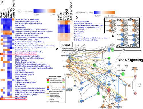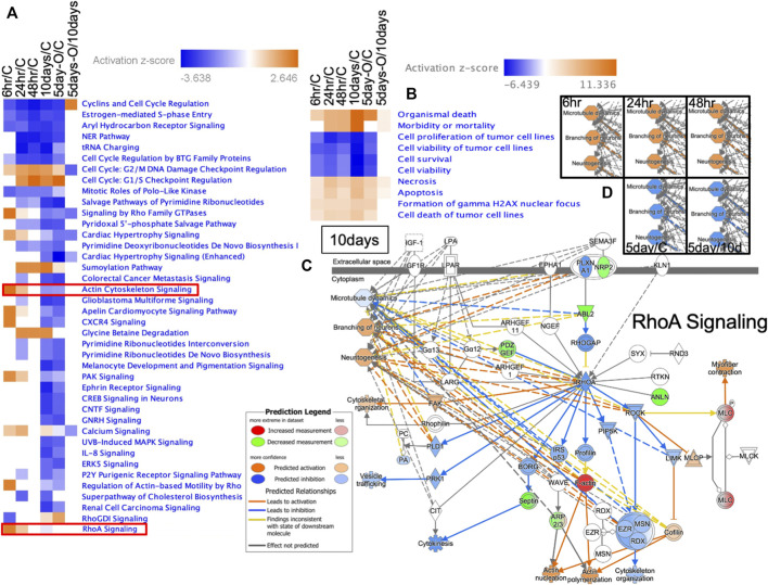 FIGURE 7. Ingenuity pathway analysis of genes expressed in the brain of Xenopus tropicalis. (A) Heat map of the signal transduction pathways in each treatment group, where 6 h/C, 24 h/C, 48 h/C, 10 days/C, and 5 days-O/C represent gene expression in the brains of Ex 6, Ex 24, Ex 48 h, Ex 10 days, and Ex 5 days-Out tadpoles divided by that in the control, respectively. Red, blue, and white represent upregulation, downregulation, and no change compared with the control, respectively. (B) Disease and function predicted by IPA based on gene expression compared with those in the control and Ex 10 days. Blue and red represent up- and downregulation, respectively. (C) Prediction of RhoA signaling based on IPA (Content v.48207413). Microtubule dynamics, branching neurons, and neuritogenesis were predicted according to the comparisons used in (D).