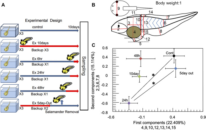 FIGURE 1. Experimental design and multiscale analysis. (A) Experimental design. Control represents no predator exposure. Ex 10 days, Ex 6, Ex 24, and Ex 48 h represent that one salamander was reared with 20 Xenopus tropicalis tadpoles in an aquarium for 10 days, 6, 24, and 48 h before sampling, respectively. Ex 5 days-Out represents that the salamander was removed after 5 days, and that the tadpoles were reared for the next 5 days without predation threat. Red arrows represent the period that the salamander was present. Each treatment group had three replicate aquaria. (B) Body parameters of the tadpoles measured for principal component analysis. Body weight was measured as parameter 1. Data were analyzed using ImageJ (ver1.53e: https://imagej.nih.gov/ij/index.html). (C) Results of the averaged PCA. Ex 10 days, Ex 48, Ex 24, Ex 5 days-Out, and control are shown as 10 days, 48, 24 h, 5 days out, and C, respectively. X-axis shows the main measurement factors chosen for the first principal component (numbers 4, 9, 10, 12, 13, 14, and 15; see Figure 2B). y-axis shows the main measurement sites selected for the second component (2, 3, 6, 7, and 8). The bars on the x-axis and y-axis for each sample indicate the standard error. multivariate analysis of variance (MANOVA) was performed on the principal component analysis (PCA) results. * denotes statistically significant (p < 0.05) differences for both the first and second components. Error bars indicate standard errors. See Supplementary Methods and Supplementary Table S4 for detailed information.