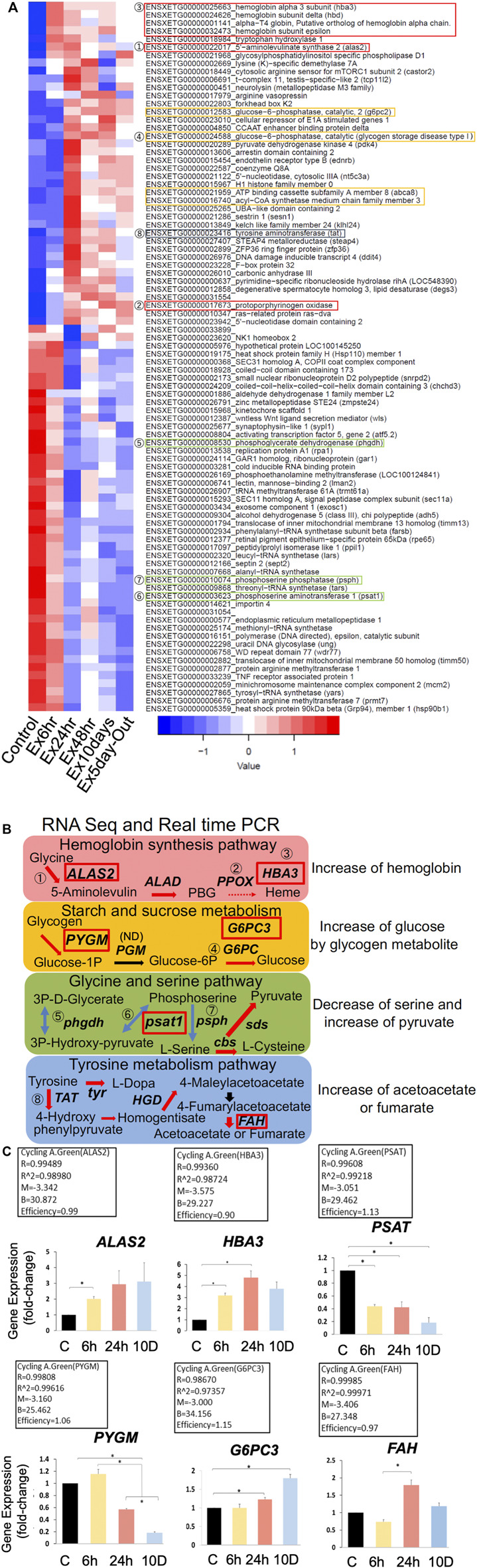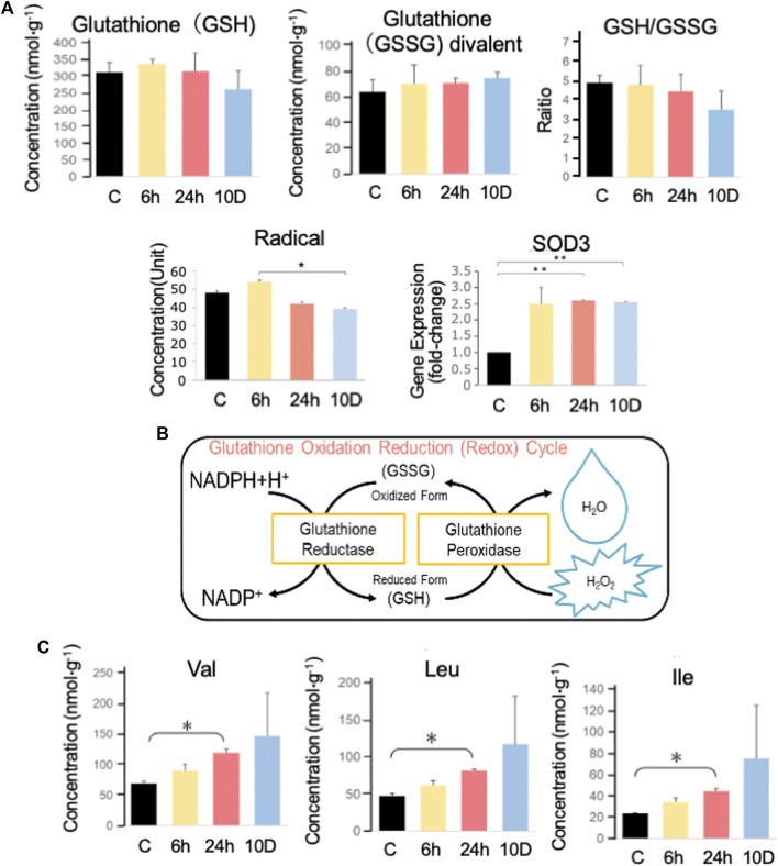 FIGURE 4. Capillary electrophoresis–mass spectrometry (CE–MS) analysis. (A) GSH and GSSG in Xenopus tropicalis brains were measured using CE–MS analysis, and the GSH/GSSG ratio was determined. SOD3 expression was determined using real-time PCR, whereas reactive oxygen species (ROS) were measured using the d-ROMs test. (B) Illustration of the glutathione oxidation-reduction cycle. (C) Val, Leu, and Ile were measured using CE–MS analysis. Ex 10 days, Ex 48, Ex 24, Ex 6 h, and control are shown as 10 D, 48, 24, 6 h, and C, respectively. *p < 0.05 represented statistical significance based on one-way ANOVA, followed by a Bonferroni post hoc test or Dunnett’s T3 test.