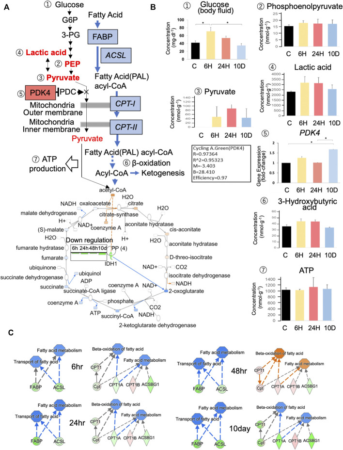 FIGURE 3. Effects of predation stress on energy production systems. (A) Metabolites and enzymes related to glycolysis, the tricarboxylic acid cycle (TCA), and ß-oxidation in the brain of Xenopus tropicalis tadpoles subjected to predator stress. Ingenuity pathway analysis (IPA) (Content v.48207413) was used to create Figure 4A. Concentration of metabolites and gene expression levels are examined in (B). Numbers ①–⑦ in (A) correspond to those shown in (B). Ex 10 days, Ex 24, Ex 6 h, and Control are shown as 10 D, 24, 6 h, and C, respectively. CE–MS and Dri-Chem systems were used to measure glucose content in brain tissue and body fluids, respectively. (C) Predictions of changes in the expression of fatty acid-binding proteins (fabp1–9), long-chain fatty-acid-CoA synthase (acsl), and carnitine O-palmitoyltransferase (cpt) type I–II using IPA. Blue and red represent down- and upregulation, respectively; green and pink represent down- and upregulation in RNA-seq data, respectively; blue and orange arrows represent down- and upregulation, respectively. * p < 0.05 represented statistical significance based on one-way ANOVA, followed by a Bonferroni post hoc test or Dunnett’s T3 test.