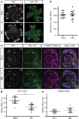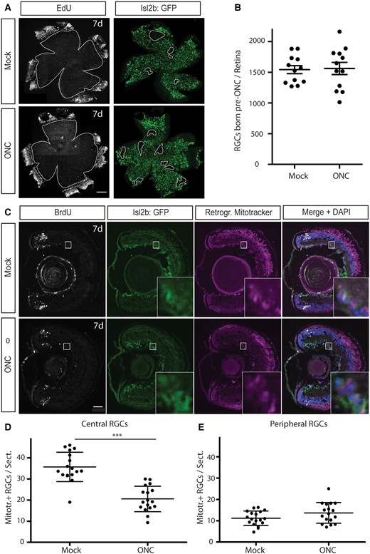 Fig. 2.In young tadpoles, the RGCs whose axons were crushed do not die and provide the majority of the tectal innervation 7 days post-ONC. A and B) RGCs present in the retina prior to the ONC survive and remain at numbers similar to mock-crushed retinas 7 days post-ONC. A) An EdU pulse administered on the day of ONC to tadpoles that express cytoplasmic GFP in their RGCs distinguishes central RGCs born prior to ONC from peripheral RGCs born after ONC. (Contours in the GFP images show dissection artifacts that were excluded from the RGC automatic counting.) Scale bar = 100 μm. B) Automated cell counts of central RGC numbers show that by 7 days post-ONC, there is no significant death of the injured RGCs. N = 12 retinas each for mock and ONC retinas. C) BrdU labeling on the day of ONC to delineate RGCs born prior to ONC from RGCs born after ONC is combined with retrograde tracing by Mitotracker at 6 days post-ONC to label those RGCs whose axons have reached the optic tectum. Merge includes nuclear labeling with DAPI. Scale bar = 50 μm. D and E) Manual counts of those RGC soma which are labeled 24 h after retrograde tracer application find that the majority of the tectal innervation 7 days post-ONC derives from the injured central RGCs. N = 15 mock and 18 ONC retinas, with a minimum of 4 cryosections counted per retina. ***P < 0.001. |