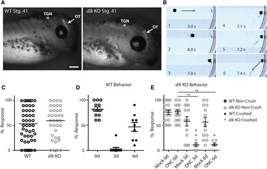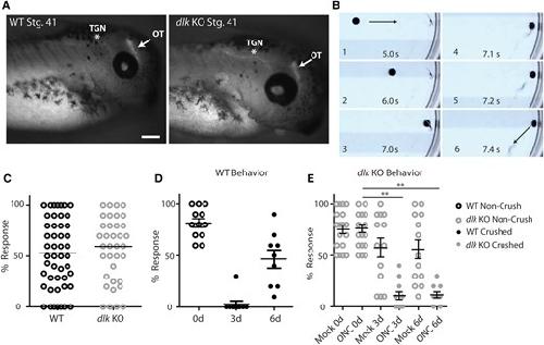 Fig. 5.Absence of Dlk does not affect developmental optic tectum innervation by RGC axons or a visually guided behavior dependent on optic tectum innervation, but does block the restoration of the visually guided behavior after ONC. A) dlk KO animals show normal optic tectum innervation at NF stage 41. Both dlk KO and WT animals express an Isl2b:mem-GFP transgene. Note that Isl2b promoter expresses also in trigeminal neurons and sparse neurons in hindbrain and spinal cord, which also were not affected by KO of dlk. OT, optic tectum; TGN, trigeminal nucleus. Scale bar = 200 μm. B) A behavioral test of vision in Xenopus laevis tadpoles. A black dot stimulus projected from an LED screen beneath a glass-bottomed bowl is manually directed at the tadpole (still frames 1–3). If tadpole immediately darts away from the stimulus, trial is counted as a response (still frames 4–6). The percent response is then calculated after 10 mock collisions. C) Both WT and dlk KO animals show a similar range of responses to behavioral assays. Only animals that responded to 50% or more of the pretrials were included in subsequent ONC experiments. D) WT tadpoles subjected to bilateral ONC lose the dot-avoidance response by 3 days post-ONC, but largely regain it by 6 days post-ONC. E) dlk KO animals subjected to bilateral ONC but not mock-crush lose the dot-avoidance behavior 3 days post-ONC and do not recover it by 6 days post-ONC. “Non-Crush” dlk KO animals at 3 and 6 days were subjected to a mock crush following the prescreening prior to surgery. |