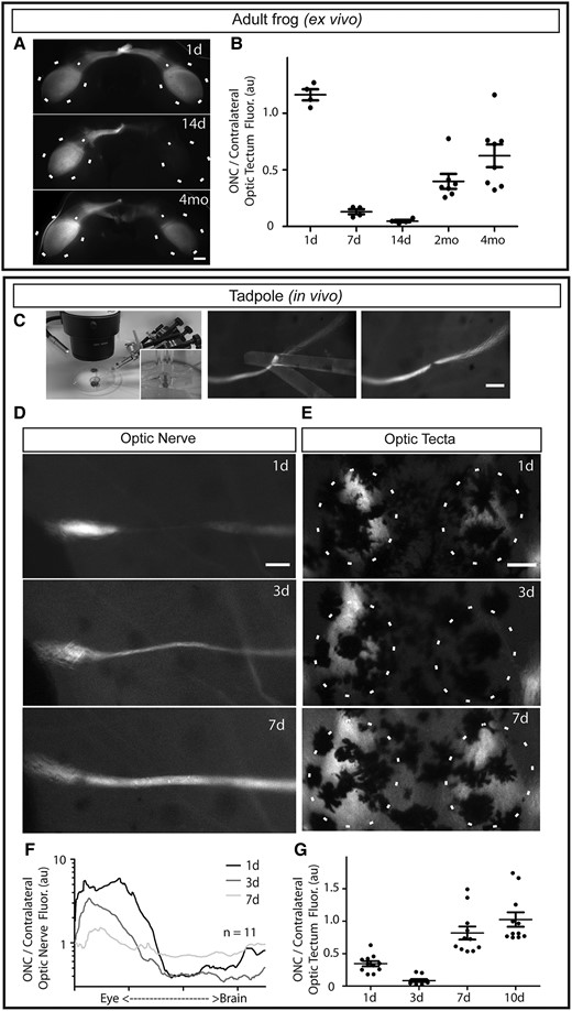 Fig. 1.ONC assay in young Xenopus laevis tadpoles has a fast time course and enables live imaging of degeneration and regeneration in optic nerves and optic tecta. A and B) In adults, regeneration takes months and must be measured ex vivo. A) Dissected flattened brain preparations showing GFP driven by an RGC-specific promoter (the fourth month image shows what appears to be a doubled optic chiasm due to a dissection artifact). Scale bar = 1 mm. B) Time course of regeneration in adult frogs. C–G) Novel surgical and live-imaging/quantification assays in young tadpoles. C) Young tadpole ONC surgical procedure. Micromanipulator-mounted needles, visualized alongside fluorescent optic nerves, are used to crush the optic nerve in 8-day-old tadpoles. (Contrast settings for the needles in the middle panel were nonuniformly lightened to better show their placement.) D and E) The optic nerve and optic tecta of the same animal are live imaged over the course of axonal degeneration and regeneration. Scale bar = 100 μm. F) Measures of fluorescence along the injured optic nerve, normalized to equivalent positions along the uninjured contralateral nerve, show the transient large increase in fluorescence proximal to the injury (note the logarithmic scale) and that regeneration of axons is largely complete by 7 days post-ONC. G) Measures of fluorescence in crushed optic tecta relative to contralateral tecta similarly show that denervation is complete by 3 days and innervation is largely restored by 7 days post-ONC. |