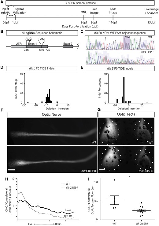 Fig. 3.F0 CRISPR screen reveals that Dlk is involved in RGC axon tectal innervation after ONC. A) Timeline for F0 CRISPR screen. F0 KO animals were generated using a transgenic line in which RGCs express GFP. sgRNA + Cas9 protein was injected within 30 min of fertilization. One day later, PCR genotyping was performed using genomic DNA from pools of 5 embryos to assess KO efficiency by TIDE analyses. At 8 days post-fertilization, GFP+ tadpoles were subjected to monocular ONC, followed by 3 days of imaging (1 day, 3 days, and 7 days post-ONC) and then tissue harvesting. B) Schematic of the first 2 exons of dlk showing the location of the sgRNA PAM within exon 1. C) Sample sequencing traces from uninjected (top) and dlk gRNA injected (bottom) embryos near the predicted CRISPR cut site. D and E) dlk gRNA F0 indel efficiency was >90% for both dlk.S and dlk.L alleles. F and G) Representative live images at 6 days post-ONC of animals near the mean of the groups (in some dlk gRNA–injected animals, the phenotype was far more pronounced). Optic nerve and optic tecta are from the same animals. F) dlk gRNA–injected animals have a nerve phenotype consistent with an inhibition or delay of RGC axon growth after ONC: thinner ON distally and thicker ON proximally relative to the ONC site. Scale bar = 100 μm. G) dlk gRNA–injected animals have somewhat diminished tectal innervation after ONC. H) Measures of fluorescence across the crushed nerve normalized to equivalent positions along the uninjured contralateral nerve (mean of 6 and 10 for WT and dlk gRNA–injected animals, respectively) show that the nerves of dlk gRNA–injected animals at 6 days post-ONC have a profile consistent with an inhibition or delay of RGC axon growth after ONC. I) Measures of fluorescence comparing tectal fluorescence in injured tecta denervated after ONC to contralateral tecta in the same animals show that dlk gRNA–injected animals have significantly decreased tectal innervation. *P < 0.05. |