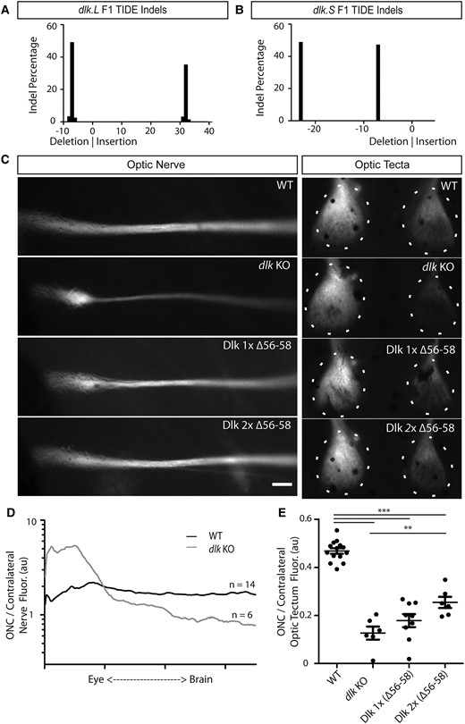 Fig. 4.Analyses of F1 animals derived from the original F0 screen demonstrate that the effect of Dlk on RGC-axonal regeneration is dose dependent. A and B) Example TIDE results showing dual frameshift mutations in the S and L chromosomes. A) TIDE trace from an F1 animal carrying a −7 deletion and a +32 insertion in its L chromosome. B) TIDE trace from a different F1 animal carrying −23 and −7 deletions in its S chromosome. C) In one line, a small in-frame deletion that eliminates 3 amino acids, Dlk Δ56–58, occurred in both S and L chromosomes of F1 animals. Two copies of Dlk Δ56–58 resulted in the least severe phenotype, while having only frameshift alleles (dlk KO) resulted in the most severe phenotype. Scale bar = 100 μm. D) Measures of fluorescence across the crushed nerve normalized to equivalent positions along the uninjured contralateral nerve show that, compared with WT crushed nerves, in F1 dlk full KO animals, the proximal nerve remains enlarged, while the distal nerve fluorescence is attenuated at 6 days post-ONC. E) Measures of fluorescence comparing the crushed to the uninjured contralateral optic tecta show an allelic series in which rising copy number of the Dlk Δ56–58 mutation results in progressively less severe axonal regeneration defects. ***P < 0.001, **P < 0.01. |