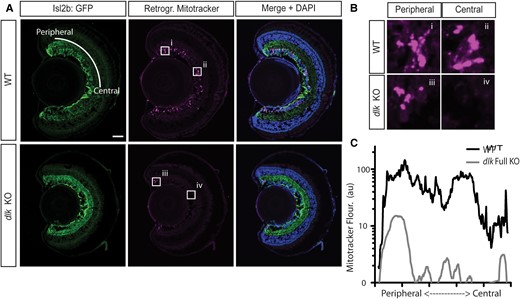 Fig. 6.Dlk is necessary for optic tectum reinnervation by RGCs whose axons have been injured, but is dispensable for the optic tectum innervation by RGCs born at the CMZ after the injury. A and B) Tectal innervation assessed at 7 days post-ONC after implantation at 6 days post-ONC of Mitotracker into the optic tecta previously innervated by the crushed nerve. Retinal sections (A) and insets shown magnified (B) show that in WT animals, the tectal innervation 7 days post-ONC derives from RGCs throughout the retina, but in the dlk KO animals, it derives from only the peripheral-most RGCs, which are derived from the CMZ. Merges include nuclear labeling with DAPI. C) Average Mitotracker fluorescence in the ganglion cell layer as a function of location within the retina (from periphery to center). N = 10 dlk KO and 12 WT retinas. Scale bar = 50 μm. |