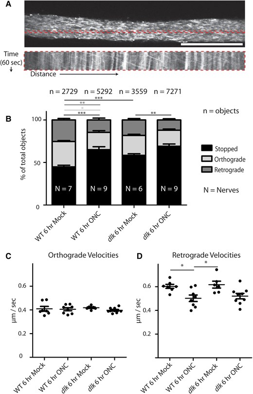 Fig. 7.The absence of Dlk does not affect the ONC-induced change in mitochondrial movement behavior proximal to the crush site 6 h post-ONC. A) Single frame of 60, from 1 Hz 1 min live imaging of Mitotracker-labeled RGC axonal mitochondria. The dotted box indicates one of many regions of interest (ROI) per nerve analyzed through kymographs; the corresponding kymograph for that ROI shown below. Scale bar = 100 μm. B) In both WT and dlk KO nerves, ONC increases the percentage of stopped mitochondria at the expense of retrogradely moving mitochondria, relative to mock-crushed nerves. N = number of nerves per group; n = number of total mitochondria analyzed in all nerves per group. *P < 0.05, **P < 0.01, ***P < 0.001. C and D) ONC does, but dlk KO does not, affect retro-grade velocities 6 h post-ONC. C) Orthograde velocities not affected by either ONC or Dlk loss. D) ONC but not loss of Dlk decreases retrograde velocities. *P < 0.05. |