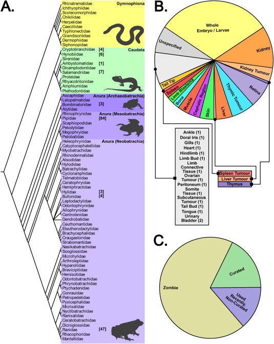 Fig. 2. The current state of the amphibian invitrome. A. A cladogram depicting the evolutionary relationships between extant amphibian orders and families, adapted from AmphibiaWeb's Family Phylogeny (AmphibiaWeb, 2022). Bolded numbers in square brackets indicate the number of reported cell lines developed from members of each family, if any. B. A pie chart summarizing the tissue origins of the reported amphibian cell lines. C. A pie chart summarizing the storage and availability status of the reported amphibian cell lines into cell lines in the curated invitrome (cell lines held in collections of formal agencies), those that have been recently used in the literature but are not curated and are likely in the informally shared invitrome (informally shared between researchers), and those that are likely in the zombie invitrome (cell lines that have been described in publications but do not appear to be used or stored any longer).