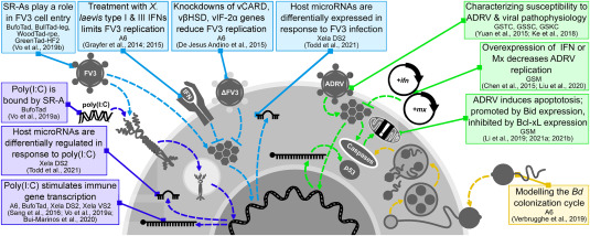 Fig. 3. Recent advances in amphibian immunology made using amphibian cell lines. In the past decade (2012–2022), immunological studies relying on amphibian cell lines have focused on monitoring responses to poly(I:C) (violet, described in Section 3.2.1), FV3 (blue, described in Section 3.3.1.1), ADRV (green, described in Section 3.3.1.2), and Bd (yellow, described in Section 3.3.2). While A6 continues to be the most widely used amphibian cell line, several recently developed cell lines from varied species and tissue origins have made major contributions. Abbreviations: ADRV, Andrias davidianus ranavirus; Bcl-xL, B-cell lymphoma-extra large; Bd, Batrachochytrium dendrobatidis; Bid, BH3-interacting domain death agonist; SR-A, Class A Scavenger Receptor; FV3, frog virus 3; IFN, interferon; poly(I:C), polyinosinic:polycytidylic acid; vβHSD, viral β-hydroxysteroid dehydrogenase; vCARD, viral caspase activation and recruitment domain-containing protein; vIF-2α, viral eukaryotic translation initiation factor 2 subunit 1.