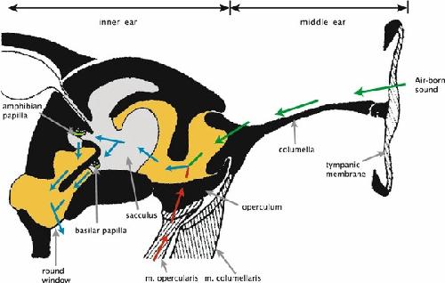 Schematic drawing of a transverse section through the frog ear (adapted from Wever 1985). The division into the middle, and inner ear is indicated above the image; a selection of features is indicated in the image. The colored arrows indicate the paths of vibrational energy: green arrows represent the columellar path, red arrows the putative opercular path, and blue arrows indicate the path through the inner ear after combination of the columellar and opercular paths. The grey areas represents endolympatic fluid, dark yellow perilymphatic fluid. The green areas indicate the tectorial membranes in the papillae. (Color figure is available in the online version)