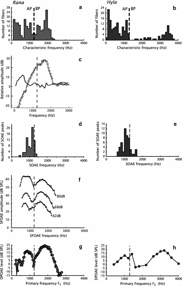 Overview of measurements of the frog inner ear; comparison between Rana (left) and Hyla (right). The dashed lines indicate the separation between the amphibian papilla and the basilar papilla. a, b Distributions of characteristic frequencies of auditory nerve fibers in Rana pipiens pipiens, and Hyla cinerea. c Example of the response of the contact membrane in R. catesbeiana; black line represents the amphibian papilla, open markers the basilar papilla. d, e Distributions of spontaneous otoacoustic emissions in ranid species (combined data from R. pipiens pipiens and R. esculenta), and hylid species (combined data from H. cinerea, H. chrysoscelis, and H. versicolor). f Example of stimulus frequency otoacoustic emissions in R. pipiens pipiens at indicated stimulus levels. g, h Examples of DP-grams measured in Rana pipiens pipiens, and Hyla cinerea. a, b, d, e, g and h are taken from Van Dijk and Meenderink (2006). There they were reproduced from Ronken (1990), Capranica and Moffat (1983), Van Dijk et al. (1989, 1996), Meenderink and Van Dijk (2004), and Van Dijk and Manley (2001), respectively. c is taken from Purgue and Narins (2000a), and f is an adapted presentation of data from Meenderink and Narins (2006) (graph created with data provided by Dr. Meenderink)