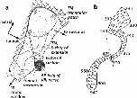 Schematic drawing of the amphibian papilla of the bullfrog, Rana catesbeiana, (adapted from Lewis et al. 1982), rotated to match orientation of Fig. 1). TM Tectorial membrane, AP amphibian papilla. a General overview of the AP; the dashed outline indicates the location of the sensory epithelium, b hair cell orientation in the sensory epithelium; dashed line indicates the position of the tectorial curtain. The numbers along the perimeter indicate the characteristic frequency of the auditory nerve fibers connecting to that site (in Hz)