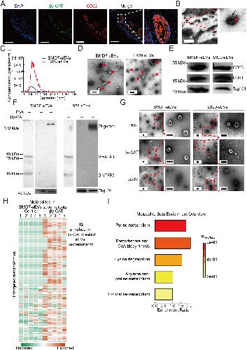 A: Colocalizations of βγ-CAT (green) and EV marker CD63 (red) in toad skin tissues were observed by laser confocal microscopy. Scale bar: 25 μm. B: Colocalizations of βγ-CAT (labeled with 5 nm colloid golden, black arrow) and EV marker CD63 (labeled with 10 nm colloid golden, red arrow) in toad skin were observed by TEM. Scale bar: 200 nm. C: Particle size distribution of sEVs isolated from BMDF (BMDF-sEVs) and L929 (L929-sEVs) cell culture medium by NTA. D: Morphological analysis of purified BMDF-sEVs and L929-sEVs by TEM. Arrows indicate EVs. Scale bar: 200 nm. E: Western blotting of purified BMDF-sEVs and L929-sEVs using EV-specific markers. F: Purified BMDF-sEVs (left) and L929-sEVs (right) were treated with βγ-CAT for 30 min, with appearance of βγ-CAT oligomers on treated EVs then determined by western blotting. G: Purified BMDF-sEVs (left) and L929-sEVs (right) were treated with PBS, LL-37, or βγ-CAT for 30 min, with ultra-morphology of EVs then observed by TEM. Scale bar: 200 nm. H: Heatmap from untargeted metabolomics of supernatants from βγ-CAT-treated and PBS-treated (control) BMDF-sEVs. Data are representative of five biological replicates. Data are related to Supplementary Table S1. I: KEGG pathway enrichment analysis of metabolites enriched in βγ-CAT-treated BMDF-sEV supernatants.