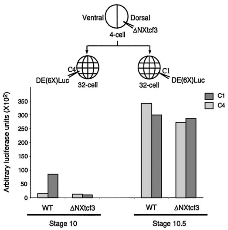 (A) or ventral (B) blastomeres at the 4-cell stage, and 6X(DE)Luc was