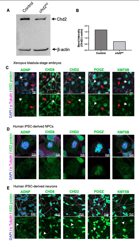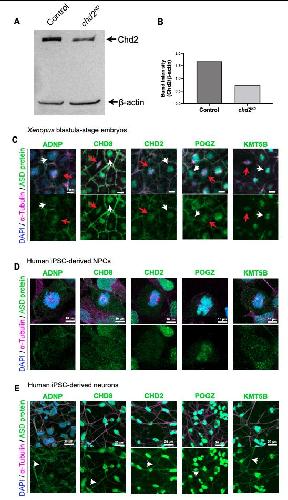 Fig. S3. Antibody stainings for ASD-associated chromatin regulators. (A) Chd2 antibody validation by western blot of control embryos and embryos injected with antisense oligonucle-otides targeting chd2. (B) Chd2 knock-down (chd2KD) causes a reduction in Chd2 protein, relative to beta- Actin. (C) Staining of X. laevis blastula-stage embryos with ASD protein antibodies. White arrows indicate interphase cells, while red arrows indicate mitotic cells. (D) Human iPSC-derived cortical NPCs stained with the ASD protein antibodies. (E) Human iPSC-derived cortical neurons stained with the ASD protein antibodies. White arrows indicate axonal staining. Related to Figure 1.