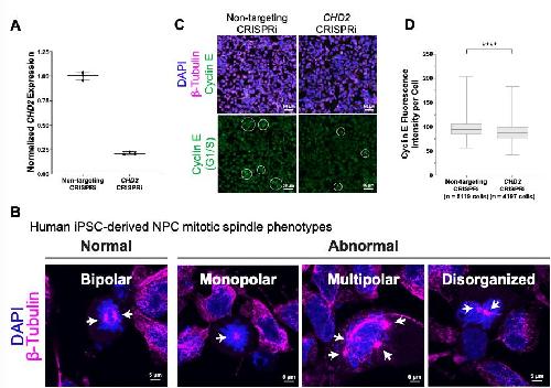 Fig. S4. CHD2 knockdown validation, spindle defect examples, and cyclin E staining. (A) CHD2 expression is reduced following CRISPRi targeting of CHD2, compared to a non-target-ing control CRISPRi line, as determined by qPCR. (B) Examples of normal and abnormal mitotic spindles for Figure 2A. (C) CRISPRi of CHD2 causes a significant decrease in cyclin E (G2/M marker) fluorescence per cell compared to a non-targeting CRISPRi line. (D) Quantification of C. Box is 25-75% interquartile range, line is median, and whiskers are max to min. **** represents p < 0.0001 by rank sum test. Related to Figure 2.