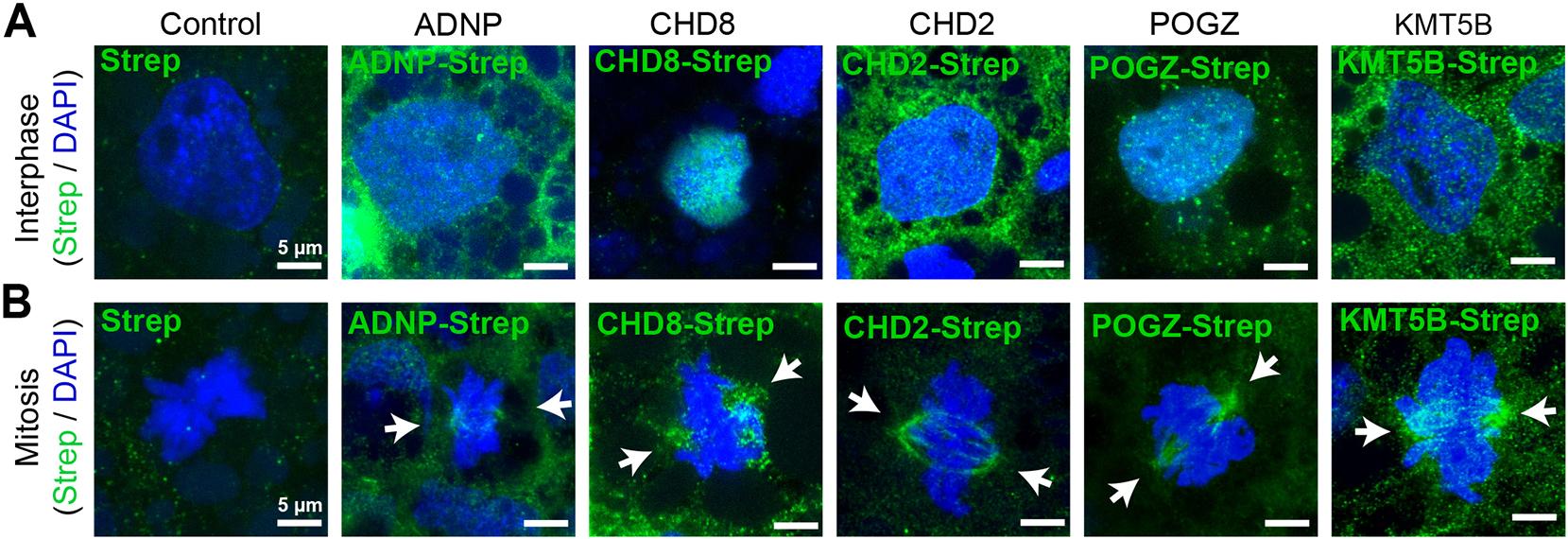 Fig. 1. ASD-associated chromatin regulators localize to microtubules. (A) Human Strep-tagged constructs for ASD-associated chromatin regulators ADNP, CHD8, CHD2, POGZ and KMT5B (labeled by Strep, green) localize to the nucleus (labeled by DAPI, blue) during interphase when expressed in Xenopus. (B) However, these constructs localize to the mitotic spindle during mitosis. Negative controls do not show these localizations. Arrows indicate spindle poles. See also Figs S1-S3.