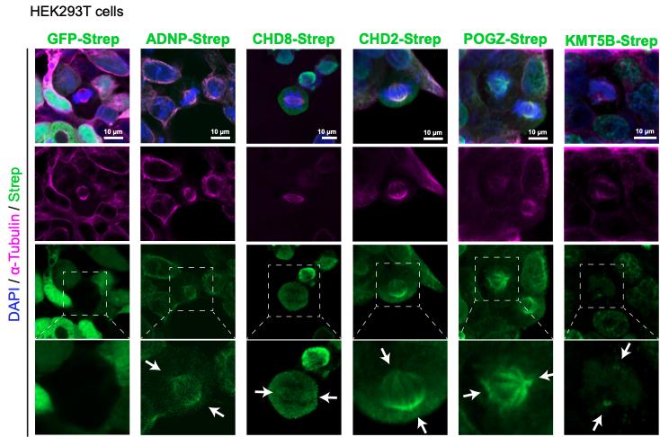 Fig. S2. ASD-associated chromatin regulators localize to microtubules in vitro. ASD-as- sociated chromatin regulators (ADNP, CHD8, CHD2, POGZ, and KMT5B) localize to the mitotic spindle or centrosome when expressed in HEK293T cells, while a control GFP-Strep construct does not. Bottom panel is a higher-magnification view of the boxed area in the panel above. Ar- rows point to the spindle poles. Related to Figure 1.