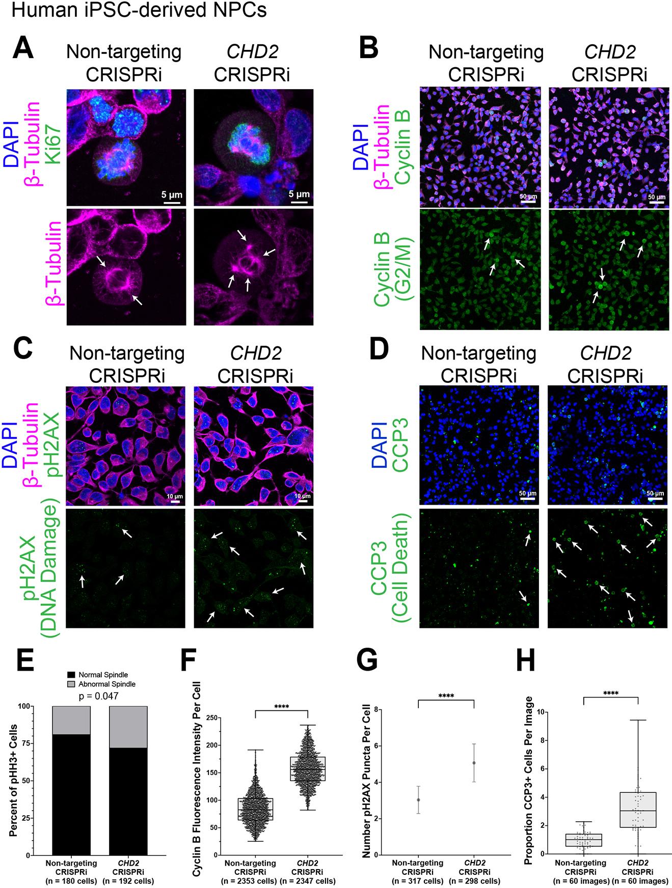 Fig. 2. CHD2 is required for mitotic spindle organization, cell cycle progression, genome stability and cell survival. (A-D) CHD2 CRISPRi in human iPSC-derived NPCs causes an increase in mitotic spindle defects (arrows, multipolar spindle) (A), in cyclin B (G2/M marker) fluorescence per cell (B), in pH2AX (DNA damage marker) puncta per nucleus (C), and in the proportion of CCP3 (cell death marker) positive cells (D) compared with non-targeting CRISPRi. (E) Quantification of the data shown in A (χ2 test). (F) Quantification of the data shown in B. Box is interquartile range, line is median, and whiskers are maximum to minimum values. (G) Quantification of the data shown in C. Dot is at the mean and lines are 95% confidence intervals. (H) Quantification of the data shown in D. Box is interquartile range, line is median, and whiskers are maximum to minimum values. ****P<0.0001 (non-parametric rank sum test). See also Fig. S4.