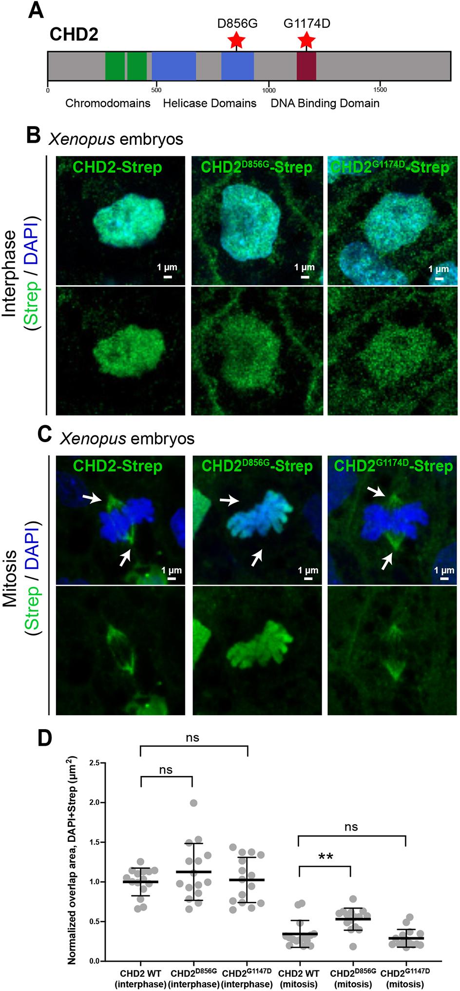 Fig. 3. A missense variant of CHD2 observed in an individual with ASD disrupts spindle localization. (A) Schematic of human CHD2 protein with functional domains and locations of likely pathogenic missense variants annotated. (B) Strep-tagged human CHD2 and ASD-associated variants CHD2D856G and CHD2G1174D expressed in Xenopus localize to the nucleus during interphase. (C) During mitosis, CHD2 and CHD2G1174D localize to spindles during mitosis, whereas CHD2D856G does not and instead remains localized to DNA (DAPI, blue). Arrows indicate spindle poles. (D) Quantification of the area of overlap between Strep and DAPI. Bars are mean and whiskers are interquartile range. **P<0.01 (one-way ANOVA). ns, not significant.