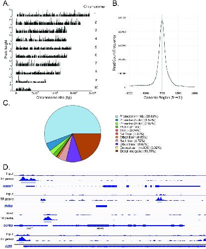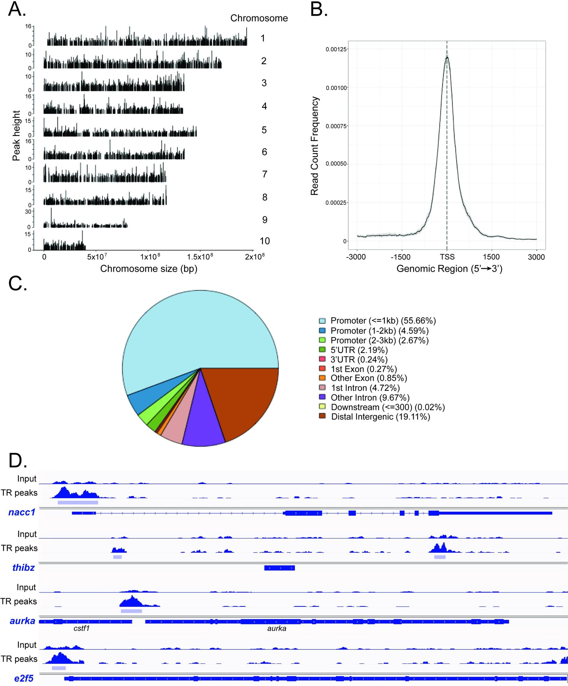 A. TR ChIP-seq peaks were found across the entire genome and uniformly distributed on the 10 chromosomes of X. tropicalis. B. A majority of TR ChIP-seq peaks were located +/- 1 kb from the transcription start sites (TSS) of genes. C. Pie chart showing the distribution of TR ChIP-seq peaks across the X. tropicalis genome by genomic feature. D. IGV genome browser tracks showing the locations of TR ChIP-seq peaks (TR peaks; light blue bars) at four loci. Shown are two genes that were upregulated (nucleus accumbens associated 1—nacc1, peak range 0–291; thyroid hormone induced bZip protein—thibz, peak range 0–250) and 2 that were downregulated (aurora kinase A—aurka, peak range 0–326; E2F transcription factor 5—e2f5, peak range 0–233) during metamorphosis. Gene structures are shown in dark blue below the genome tracks.