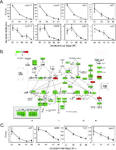 Fig 4. Cell cycle control genes and genes encoding components of the Wnt/b-catenin signaling pathway are downregulated during metamorphosis.
