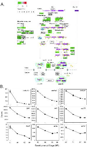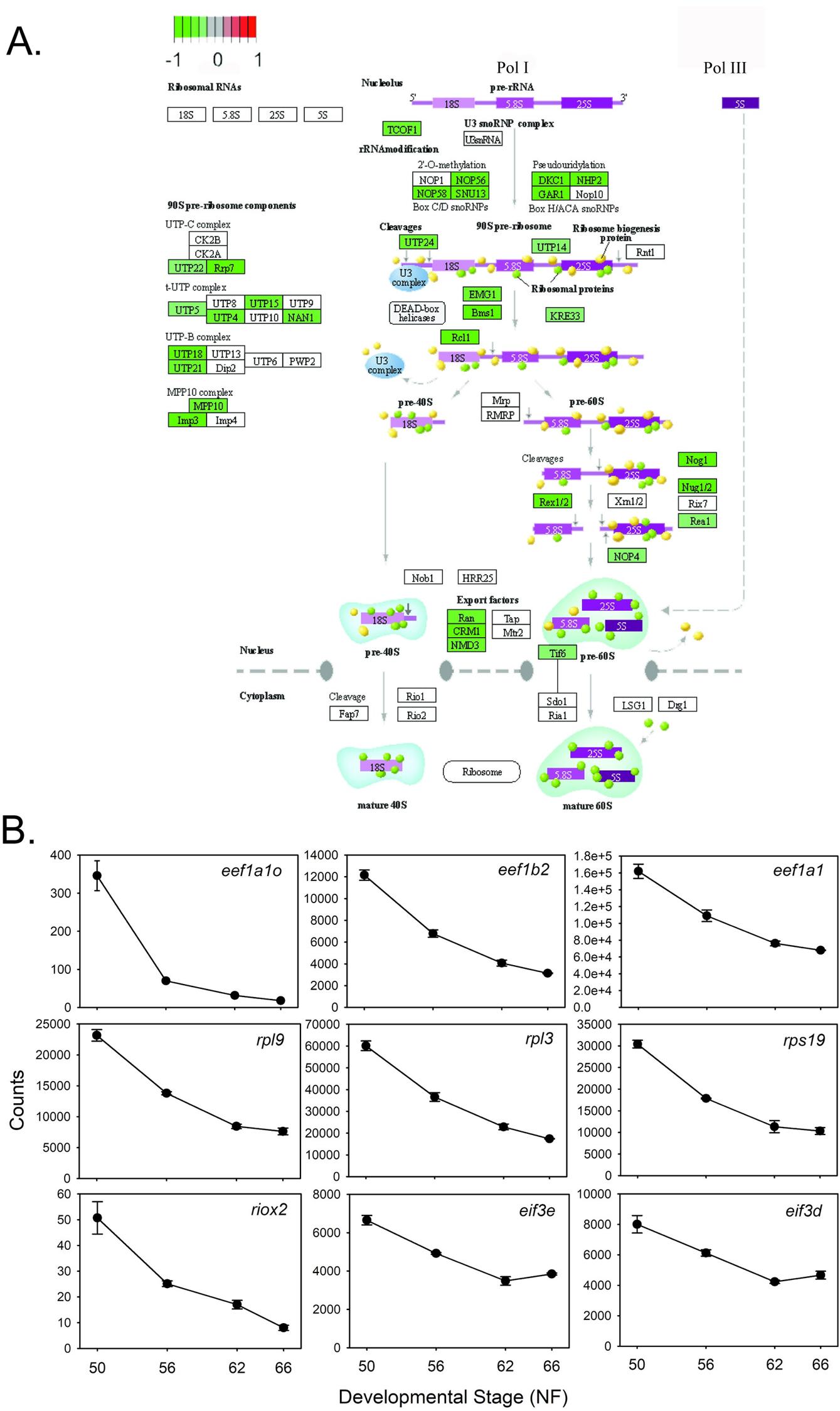 A. KEGG pathway analysis of RNA-seq data for gene expression changes during metamorphosis in X. tropicalis tadpolebrain (preoptic area/thalamus/hypothalamus). Shown is the ribosome biogenesis pathway. B. Shown are the mean+SEM (n = 3/NF developmental stage) of RNA-seq count data for 9 genes: Eukaryotic translation elongation factor 1 alpha 1—eef1a1o; eukaryotic translation elongation factor 1 beta 2—eef1b2; eukaryotic translation elongation factor 1 alpha 1—eef1a1; ribosomal protein L9—rpl9; ribosomal protein L3—rpl3; ribosomal protein S19- rps19; ribosomal oxygenase 2- riox2; eukaryotic translation initiation factor 3 subunit E—eif3e; eukaryotic translation initiation factor 3 subunit D—eif3d.