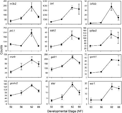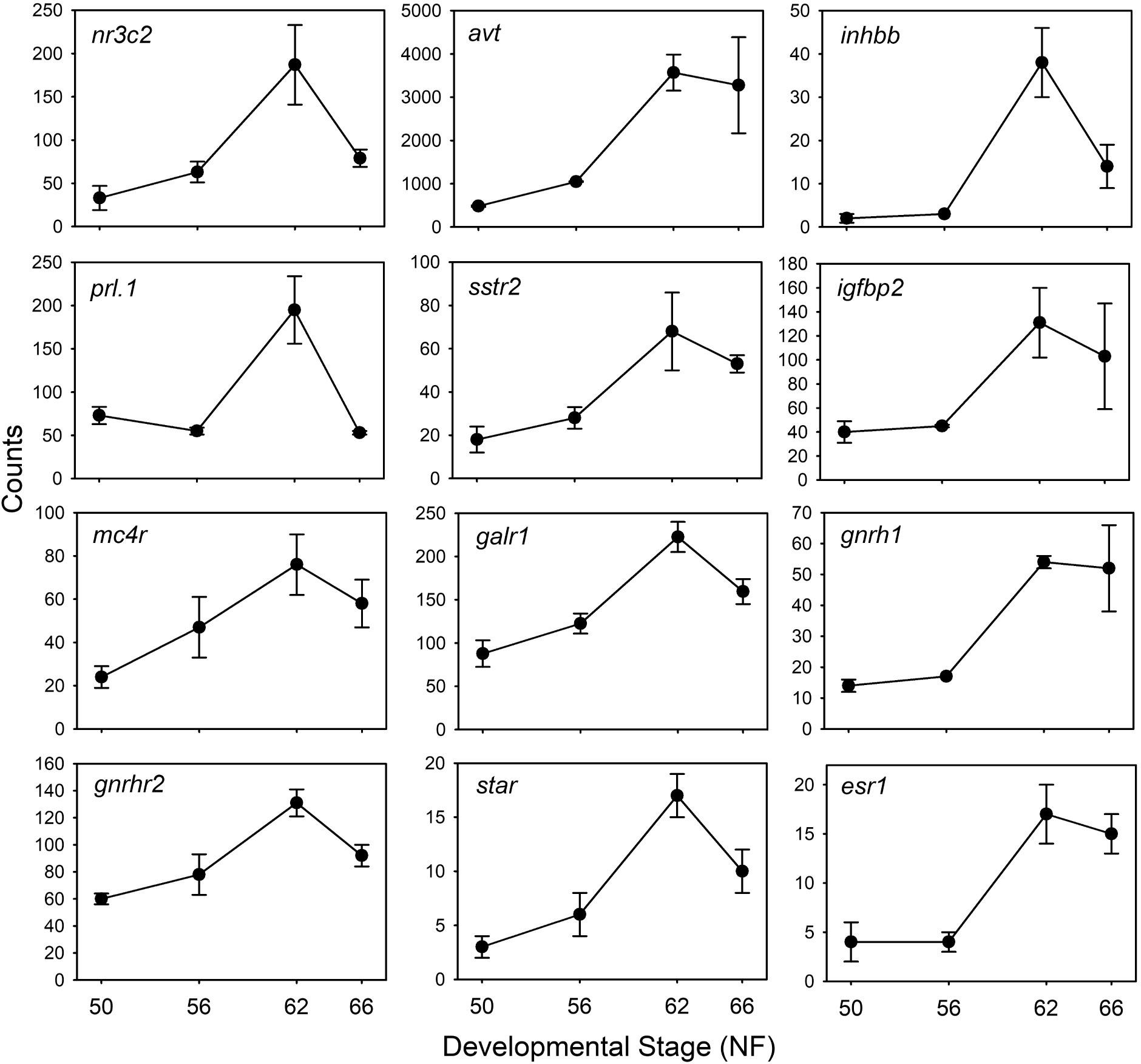 Shown are the mean+SEM (n = 3/NF developmental stage) of RNA-seq count data for 12 genes: Nuclear receptor subfamily 3 group C member 2 (mineralocorticoid receptor)—nr3c2; arginine vasotocin—avt*; inhibin subunit beta B—inhbb; prolactin, gene 1—prl.1; somatostatin receptor 2—sstr2; insulin like growth factor binding protein 2—igfbp2; melanocortin 4 receptor—mc4r; galanin receptor 1—galr1; gonadotropin releasing hormone 1—gnrh1; gonadotropin releasing hormone receptor 2—gnrhr2; steroidogenic acute regulatory protein—star; estrogen receptor 1—esr1. *This gene is mislabeled in the genome database as arginine vasopressin (avp) which is a mammalian gene. The amphibian gene is arginine vasotocin (avt).