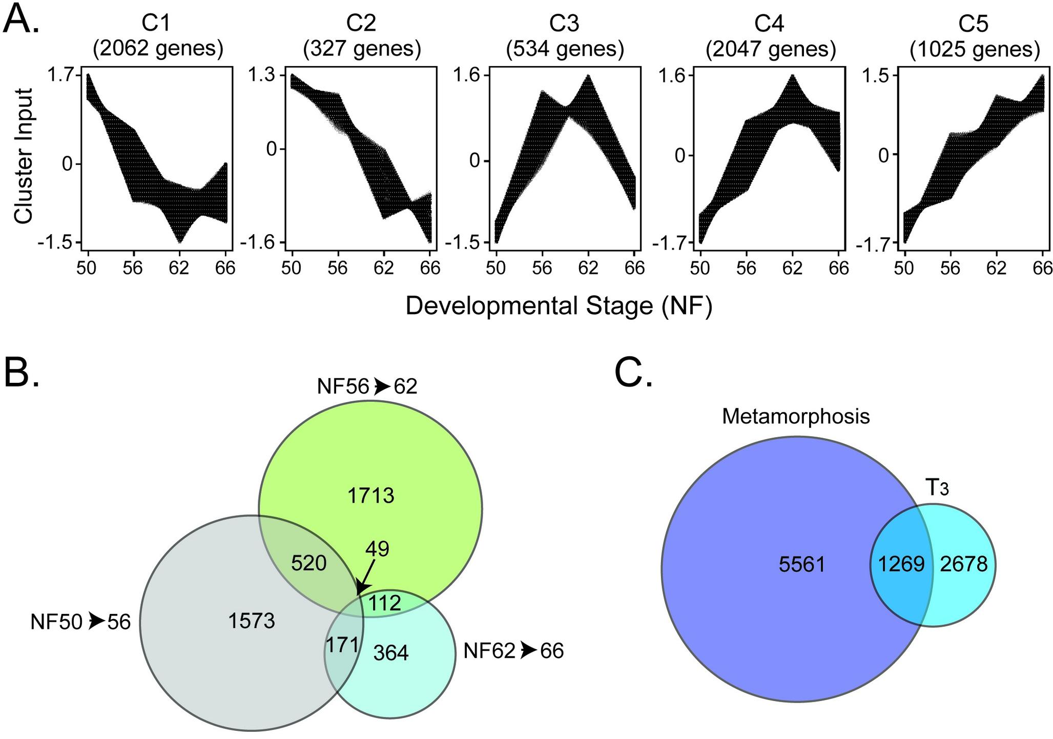 A. Clustering analysis showing five patterns of gene expression changes across four stages of metamorphosis. B. Venn diagram showing numbers of genes regulated with overlaps in three developmental stage comparisons. C. Venn diagram showing the overlap between all genes that changed expression during spontaneous metamorphosis with genes induced or repressed by exogenous T3 in premetamorphic tadpoles.