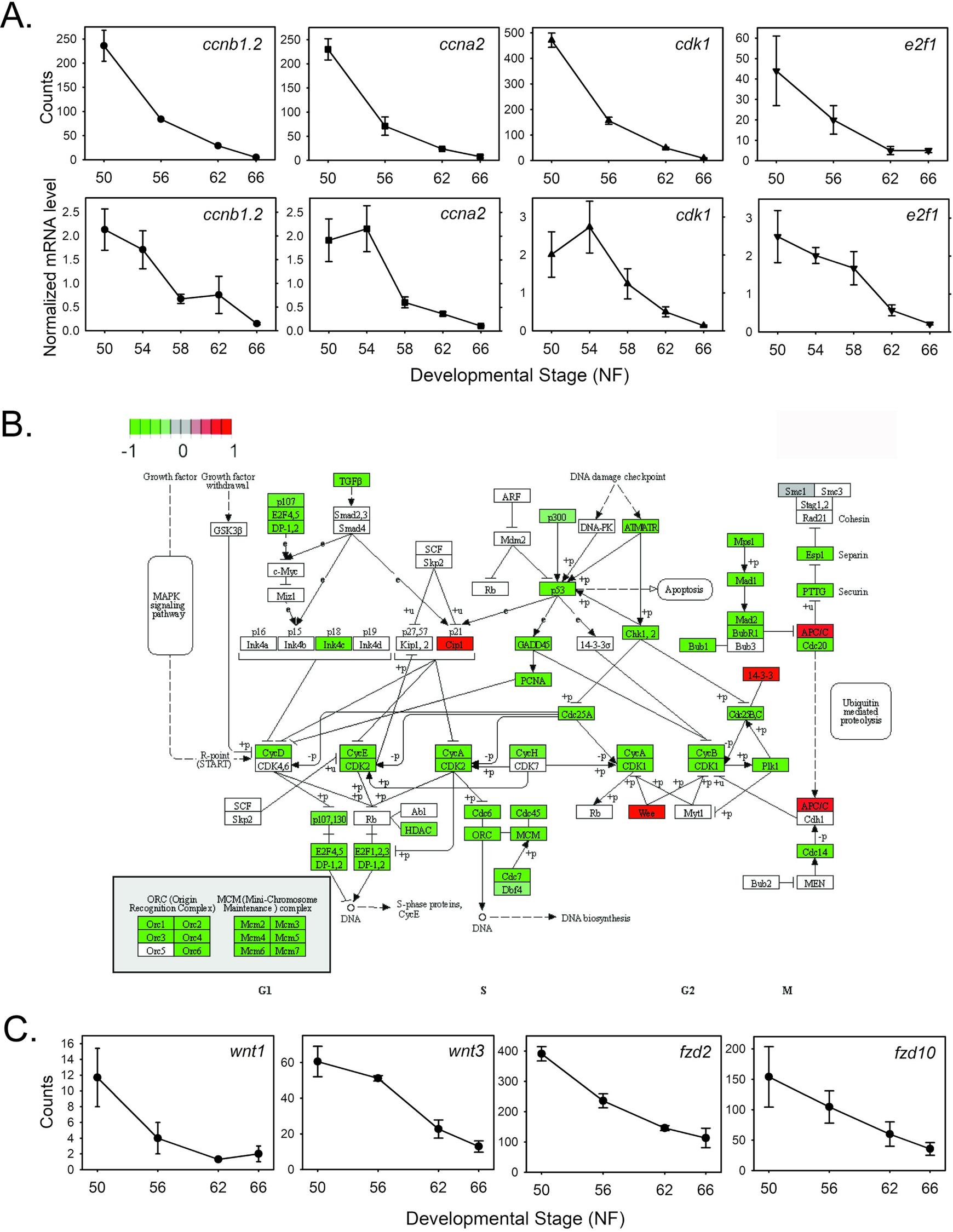 A. Shown are the mean+SEM (n = 3/NF developmental stage) of RNA-seq count data (top) and RTqPCR data (bottom; n = 5/NF developmental stage) for four cell cycle control genes: Cyclin b1—ccnb1.2; cyclin a2—ccna2; cyclin-dependent kinase 1—cdk1; E2F transcription factor—e2f1. B. KEGG pathway analysis of RNA-seq data for gene expression changes during metamorphosis in X. tropicalis tadpolebrain. Shown is the cell cycle control pathway. C. Shown are the mean+SEM (n = 3/NF developmental stage) of RNA-seq count data for 4 genes: Wnt family member 1—wnt1; Wnt family member 3—wnt3; frizzled class receptor 2—fzd2; frizzled class receptor 10—fzd10.