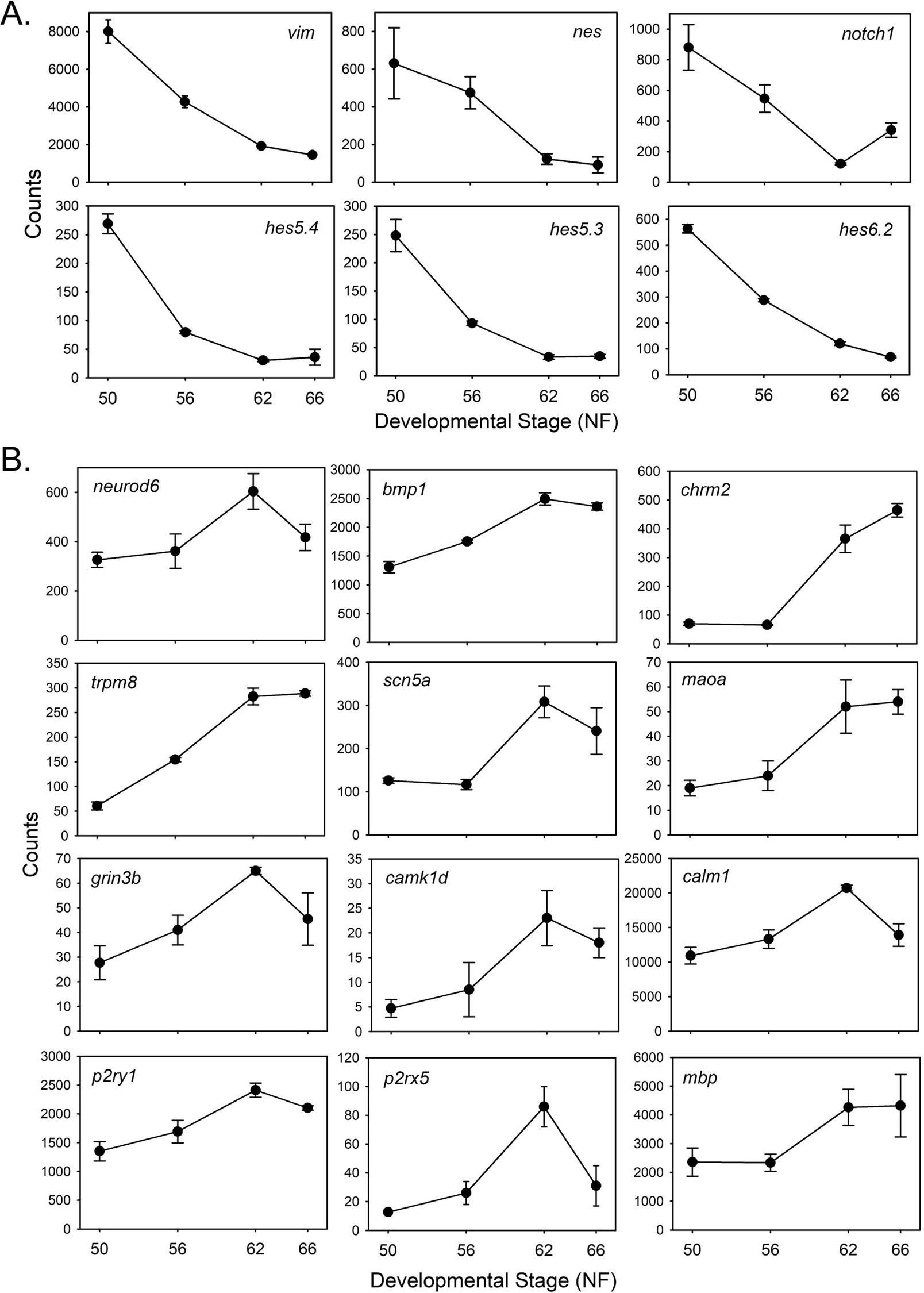 A. Shown are the mean+SEM (n = 3/NF developmental stage) of RNA-seq count data for 6 stem/progenitor cell marker genes: Vimentin—vim; nestin—nes; notch 1 receptor—notch1; hairy and enhancer of split 5 gene 4 –hes5.4; hairy and enhancer of split 5 gene 3—hes5.3; hairy and enhancer of split 6 gene 2—hes6.2. B. Shown are the mean+SEM (n = 3/NF developmental stage) of RNA-seq count data for 12 neural differentiation-related genes: Neuronal differentiation 6—neurod6; bone morphogenetic protein 1—bmp1; cholinergic receptor muscarinic 2—chrm2; transient receptor potential cation channel, subfamily M, member 8—trpm8; sodium channel, voltage gated, type V alpha subunit—scn5a; monoamine oxidase A—maoa; glutamate receptor, ionotropic, N-methyl-D-aspartate 3B - grin3b; calcium/calmodulin dependent protein kinase ID—camk1d; calmodulin 1—calm1; purinergic receptor P2Y, G-protein coupled, 1—p2ry1; purinergic receptor P2X, ligand gated ion channel, 5—p2rx5; myelin basic protein—mbp.