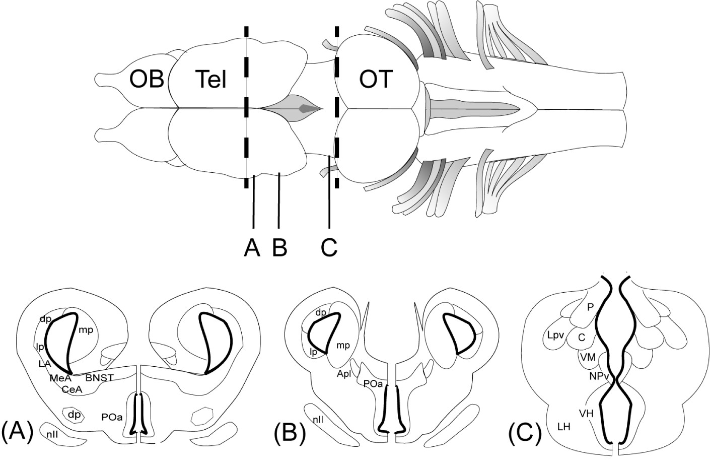 The coronal anatomical diagrams of Xenopus brain are from Tuinhof and colleagues [93] with modifications by Yao and colleagues [94]. Dotted lines demarcate the region of the tadpolebrain that was dissected. Abbreviations: Apl, Amygdala pars lateralis; BNST, bed nucleus of the stria terminalis; C, central thalamic nucleus; CeA, central amygdala; dp, dorsal pallium; LA, lateralamygdala; LH, Lateralhypothalamus lp, lateralpallium; Lpv, lateral thalamic nucleus, pars posteroventralis; MeA, medialamygdala; mp, medialpallium; NPv, nucleus of the paraventricular organ; nII, cranial nerve II; OB, olfactory bulb; OT, optic tectum; P, posterior thalamic nucleus; POa, preoptic area; Tel, telencephalon; VH, ventral hypothalamic nucleus; VM, ventromedial thalamic nucleus.