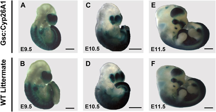 FIGURE 4. RARE-LacZ expression returns to normal in E9.5 Gsc+/Cyp26A1 embryos. (A, B) E9.5 Gsc+/Cyp26A1 embryos have a smaller head morphology compared to WT embryos, but have no distinct changes in RARE-LacZ patterning compared to WT. E10.5 and E11.5 (E) Gsc+/Cyp26A1 embryos do not show distinct changes in embryonic patterning, gross morphology or intensity of RARE-LacZ expression in the frontonasal prominence, anterior somites, or developing trunk, as WT embryos (D, F, respectively). E9.5 n = 16 embryos, E10.5 n = 14 embryos, E11.5 n = 15 embryos, n = 2 (litters) per timepoint. Scale Bars: 500um (A–D), 1 mm (E, F). |