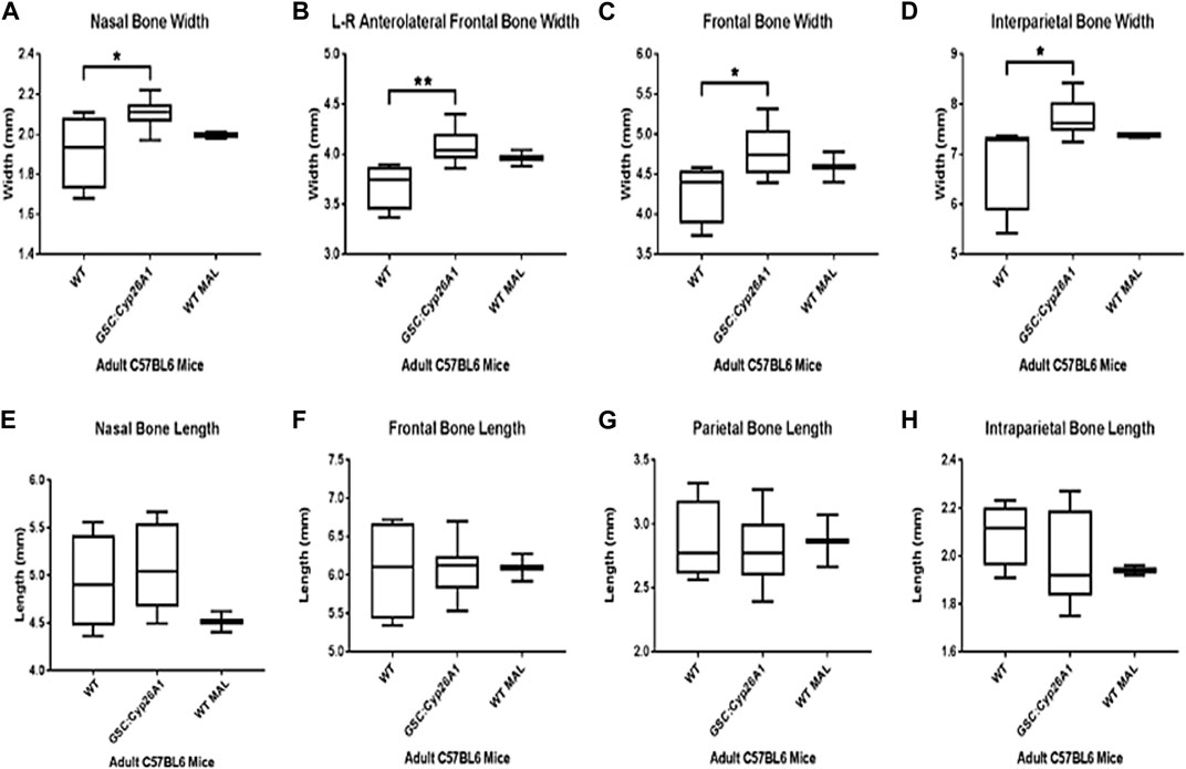 FIGURE 9. Gsc+/Cyp26A1 mice have a wider cranium compared to WT littermates. P60 Gsc+/Cyp26A1 mice show a statistically significant wider cranium in all 4 major skull region width measurements: Nasal Bone (A), L-R Anterolateral Frontal Bone (B), Frontal Bone (C), and Intraparietal Bone Widths (D). Gsc+/Cyp26A1 mice do not demonstrate a statistically significant difference in the 4 major skull region length measurements: Nasal Bone (E), Frontal Bone (F), Parietal Bone (G) and Intraparietal Bone lengths (H). Gsc+/Cyp26A1 mice, n = 10; C57BL/6N mice, n = 5; WT with spontaneous malocclusions, n = 3. A t-test was used to determine statistical significance. *p < 0.05, **p < 0.01. |
